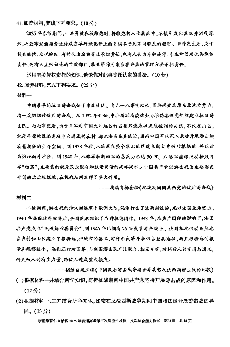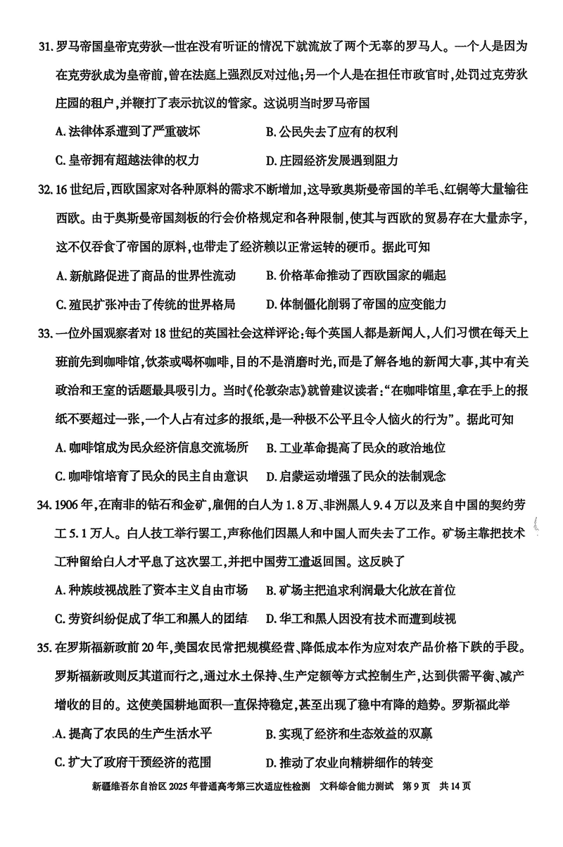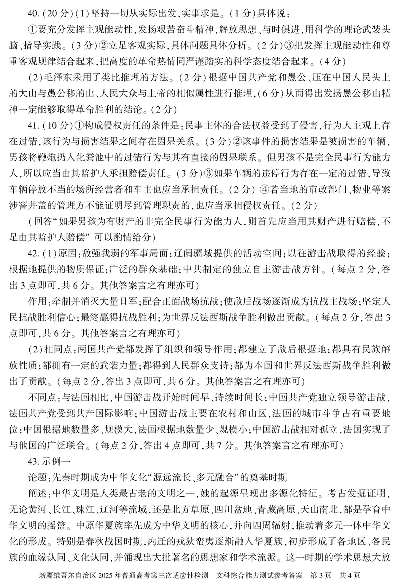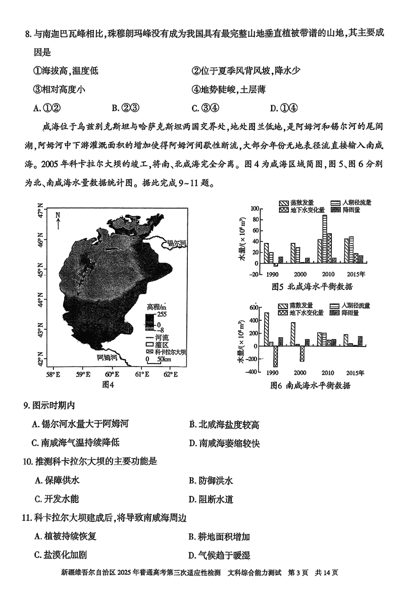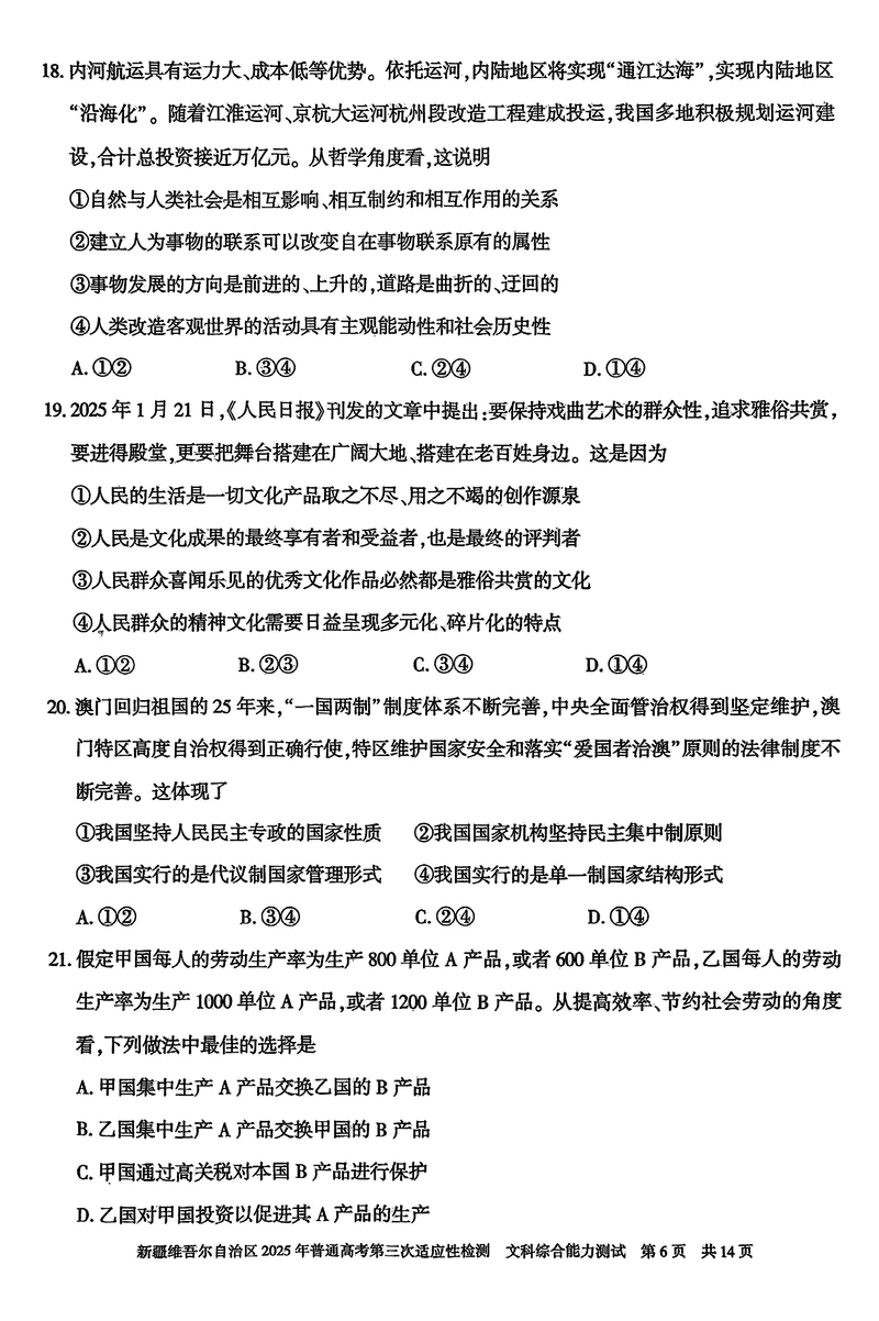 新疆2025届高三下学期第三次适应性检测文综试题及答案