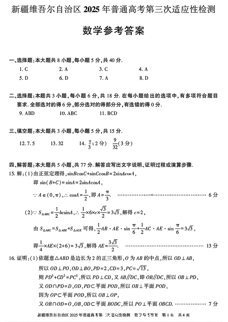 新疆2025届高三下学期第三次适应性检测数学考试已于近日开考,为方便考生考后及时查看考试情况,查漏补缺、弥补不足,本文整理了试题答案解析相关信息!