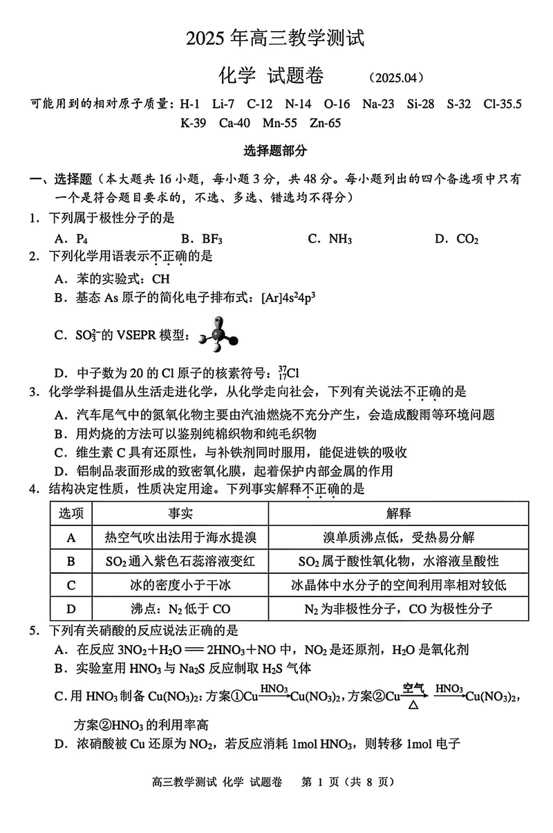 嘉兴二模2025届高三下学期4月教学测试化学试题及答案