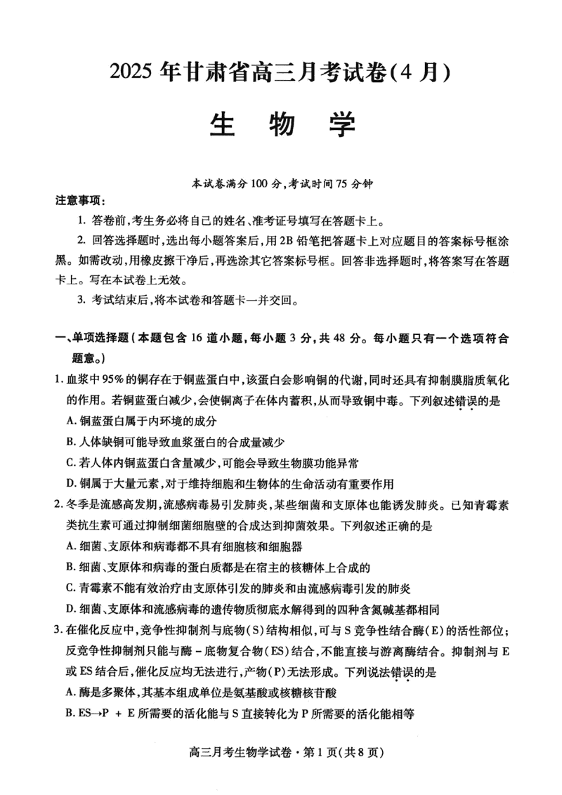 甘肃二诊2025年高三4月月考生物试题及答案 时间:2025-04-12 甘肃 理综试题 甘肃二诊2025年高三4月月考生物考试已于近日开考,为方便考生考后及时查看考试情况,查漏补缺、弥补不足,本文整理了试题答案解析相关信息! 汇总:甘肃二诊2025年高三4月联考试题及答案汇总 生物试题及答案解析