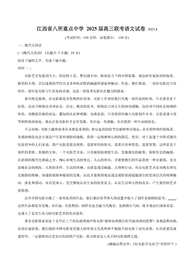 江西省八所重点中学2025届高三4月联考语文试题及答案
