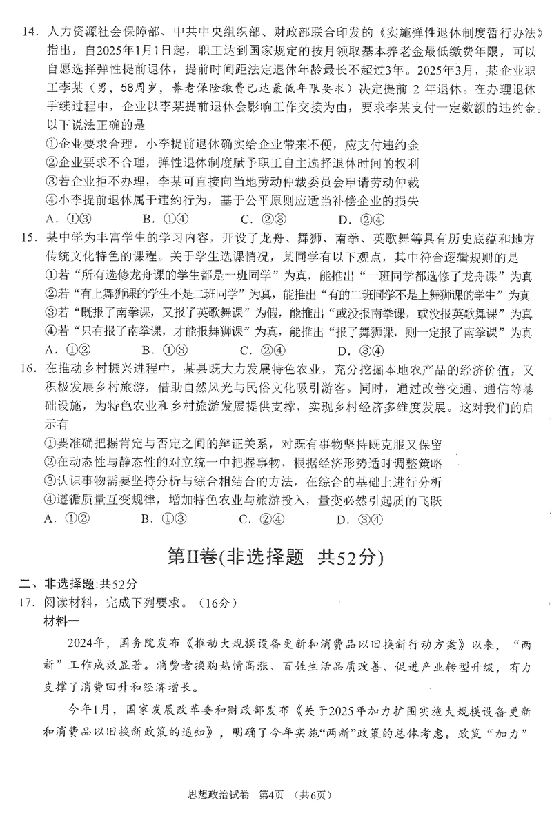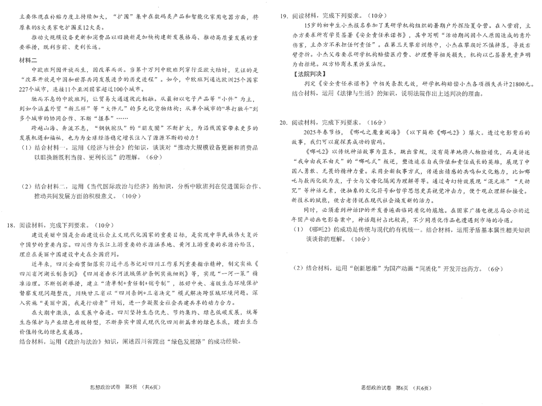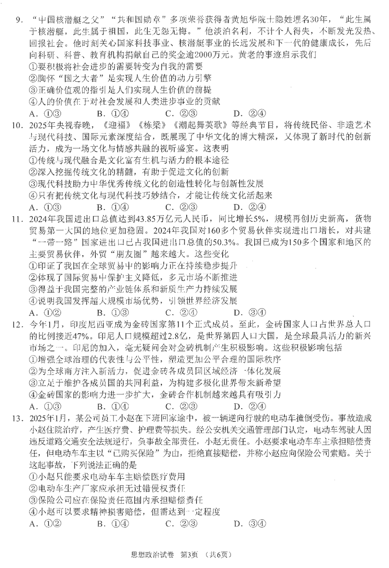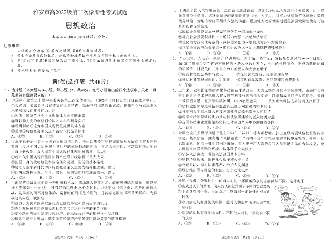 雅安市2025届高三下学期第二次诊断性政治试题及答案