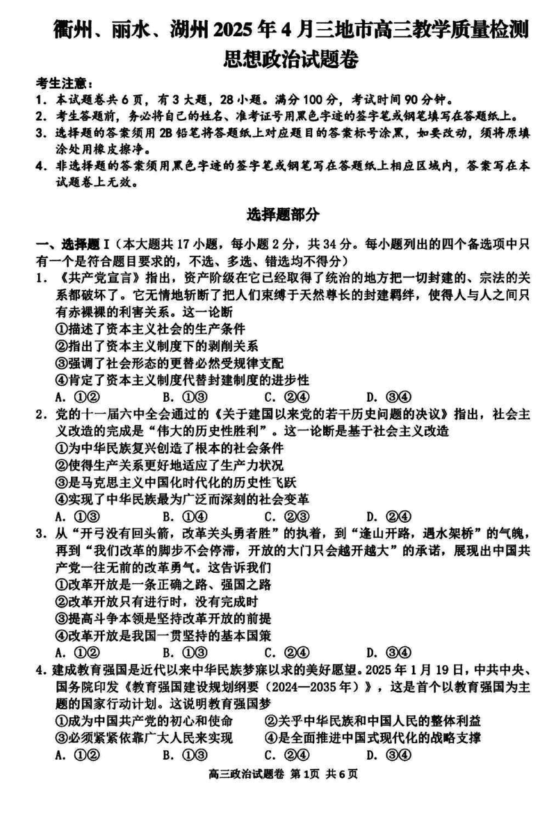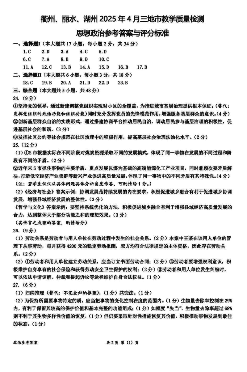 衢州、丽水、湖州三地市二模2025年4月高三教学质检政治试题及答案