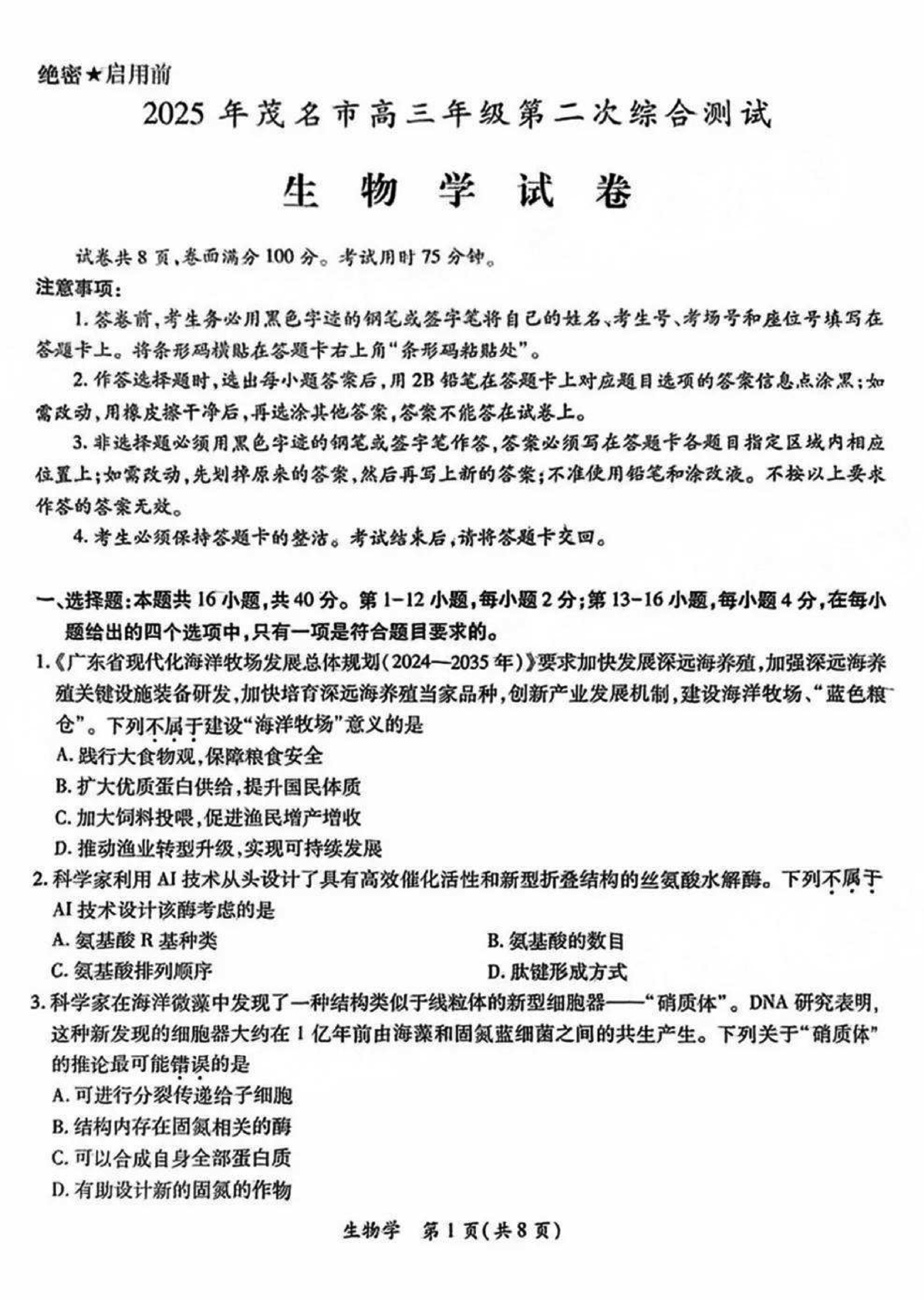 茂名二模2025年高三第二次综合测试生物试题及答案 时间:2025-04-15 广东 理综试题 茂名二模2025年高三第二次综合测试生物考试已于近日开考,为方便考生考后及时查看考试情况,查漏补缺、弥补不足,本文整理了试题答案解析相关信息! 汇总:茂名二模2025年高三第二次综合测试试题及答案汇总 生物试题及答案解析
