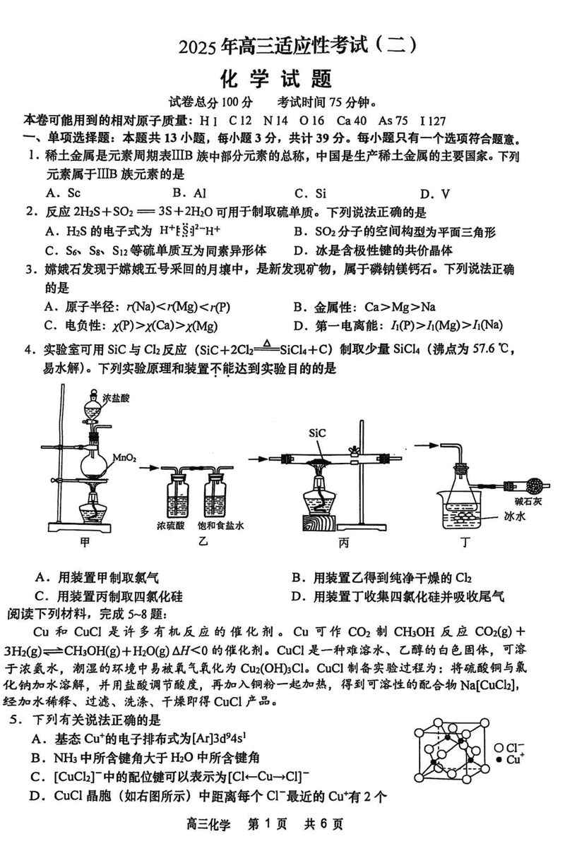 2025届江苏省南通市如皋市高三适应性考试(二)化学考试已于近日开考,为方便考生考后及时查看考试情况,查漏补缺、弥补不足,本文整理了试题答案解析相关信息!