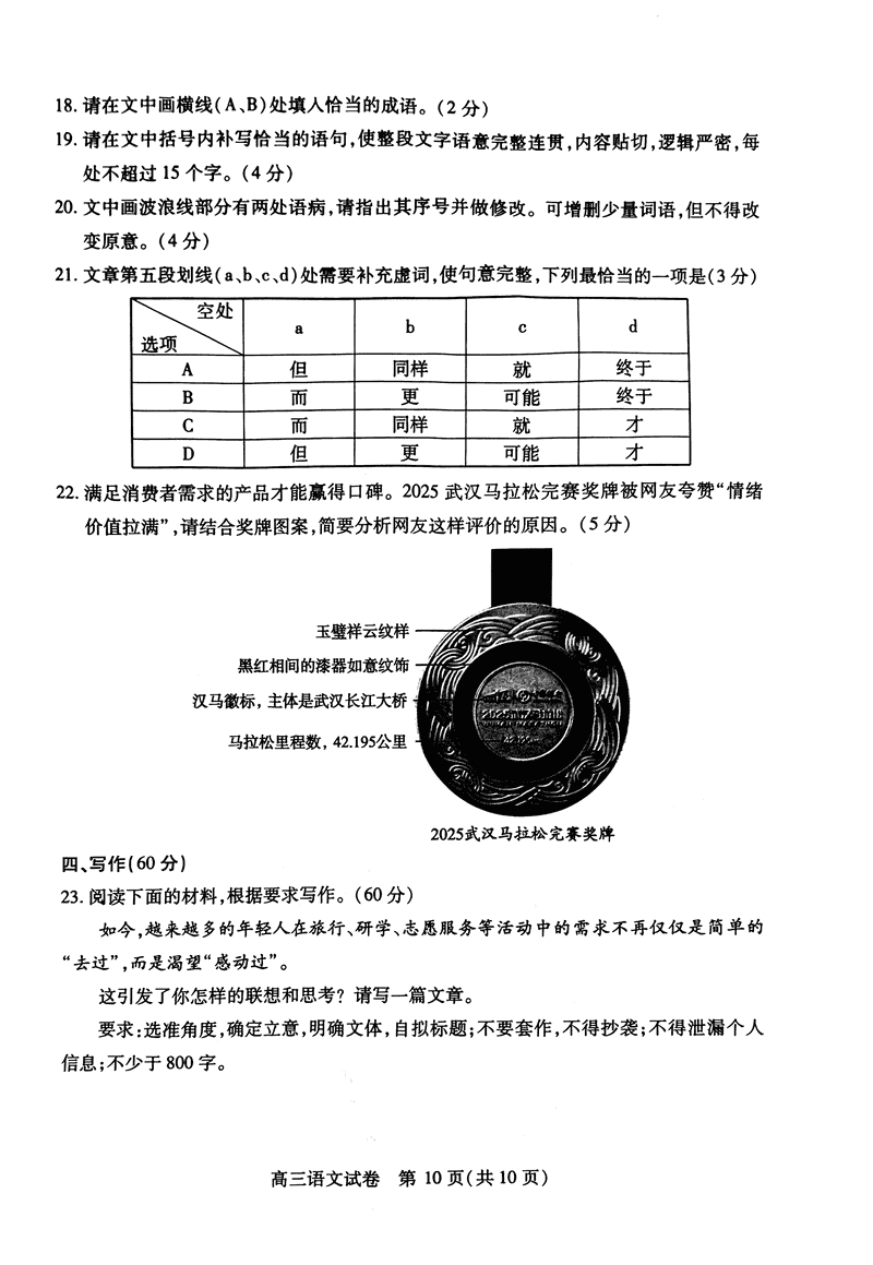 武汉市2025届高中毕业生四月调研语文试题及答案 时间:2025-04-17 湖北 语文试题 武汉市2025届高中毕业生四月调研语文考试已于近日开考,为方便考生考后及时查看考试情况,查漏补缺、弥补不足,本文整理了试题答案解析相关信息! 汇总:武汉市2025届高中毕业生四月调研考试试题及答案汇总 语文试题及答案解析