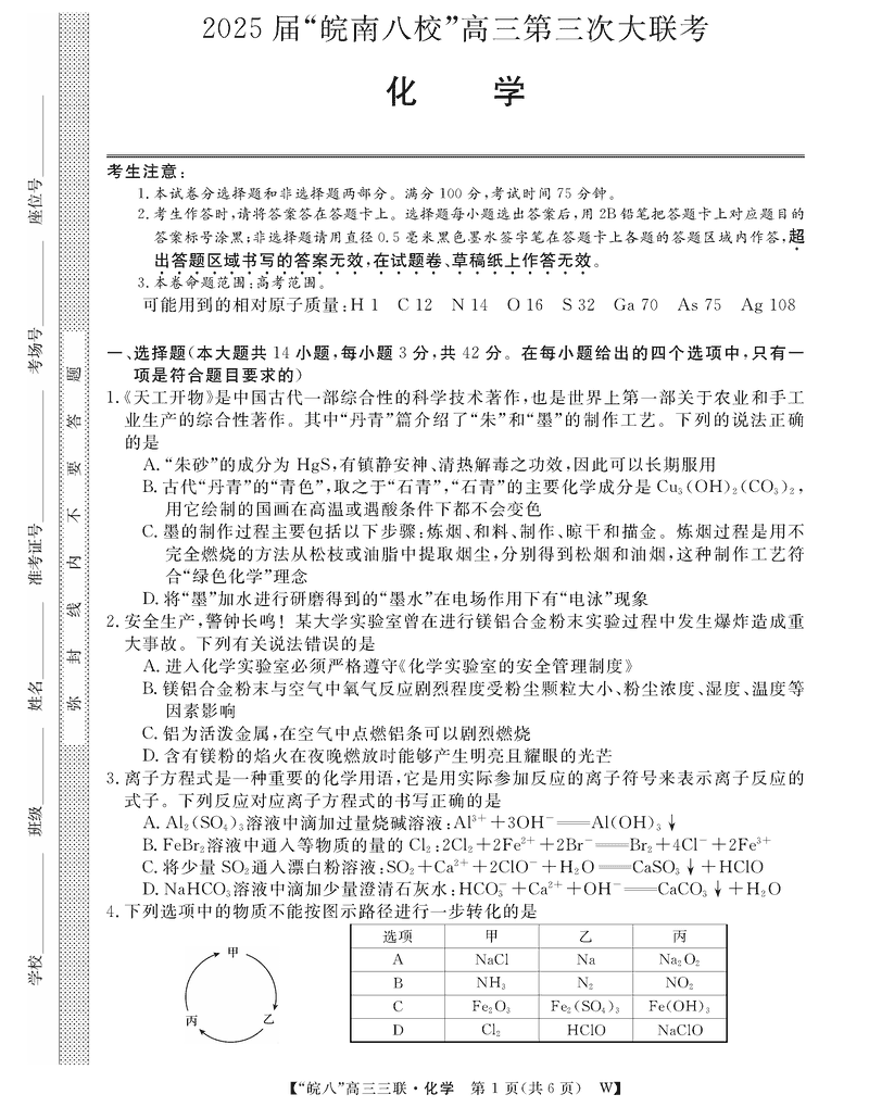 安徽皖南八校2025届高三第三次大联考化学试题及答案