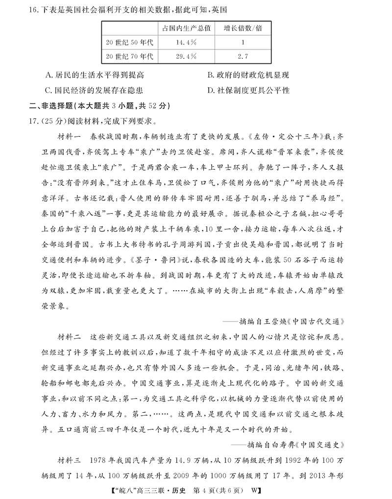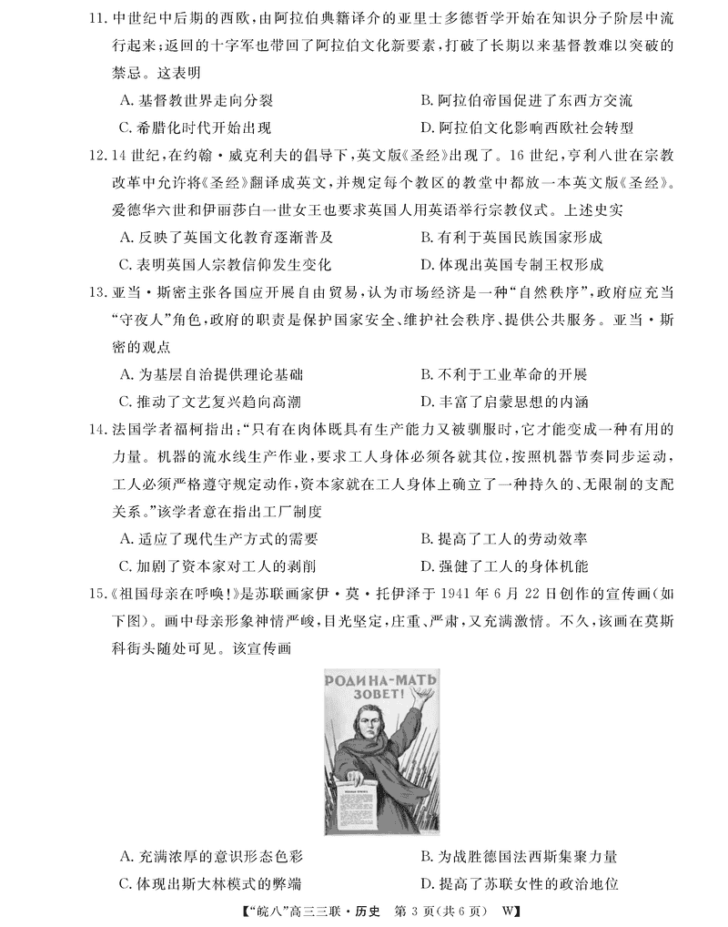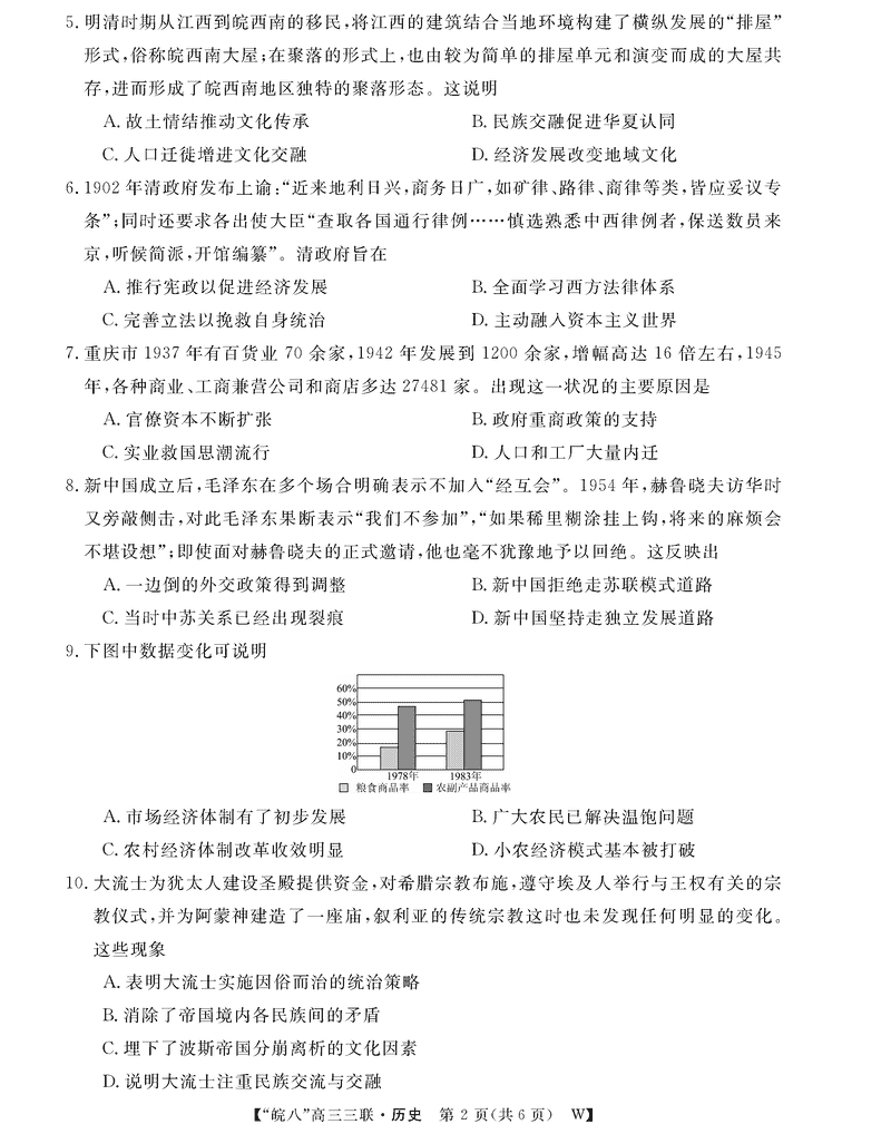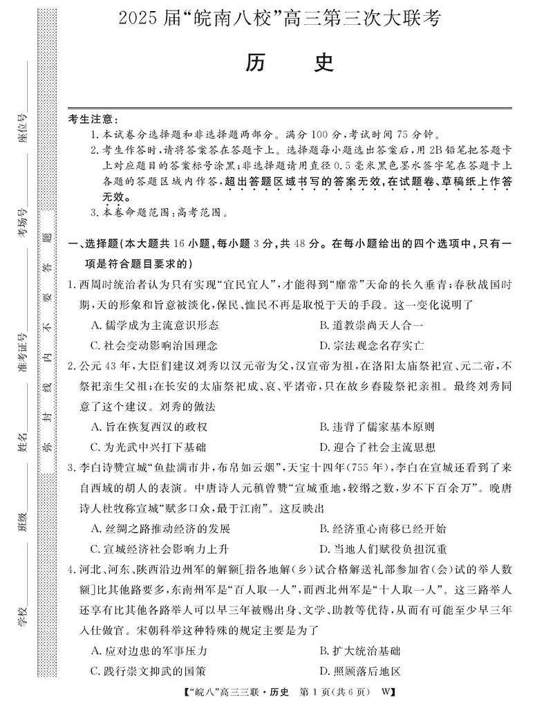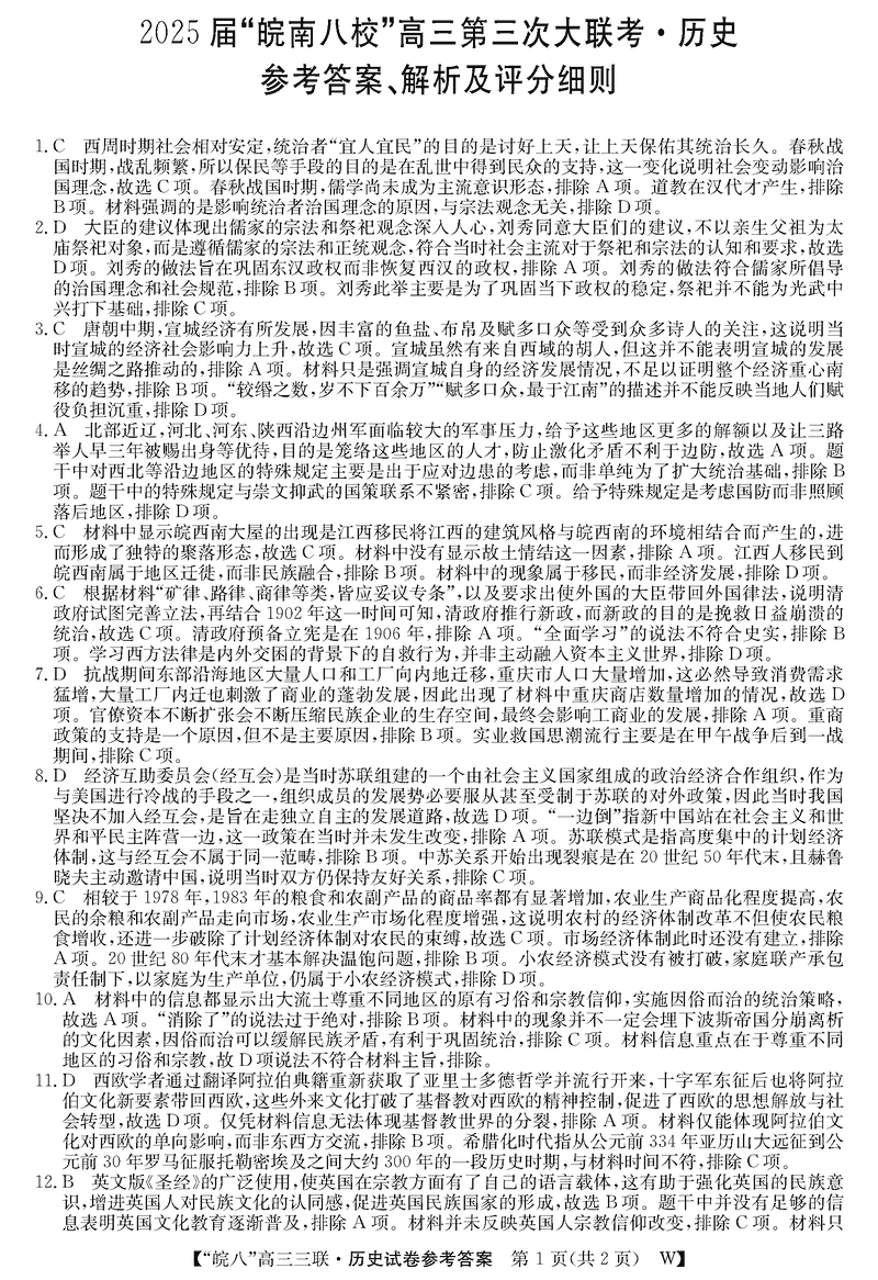 安徽皖南八校2025届高三第三次大联考历史试题及答案