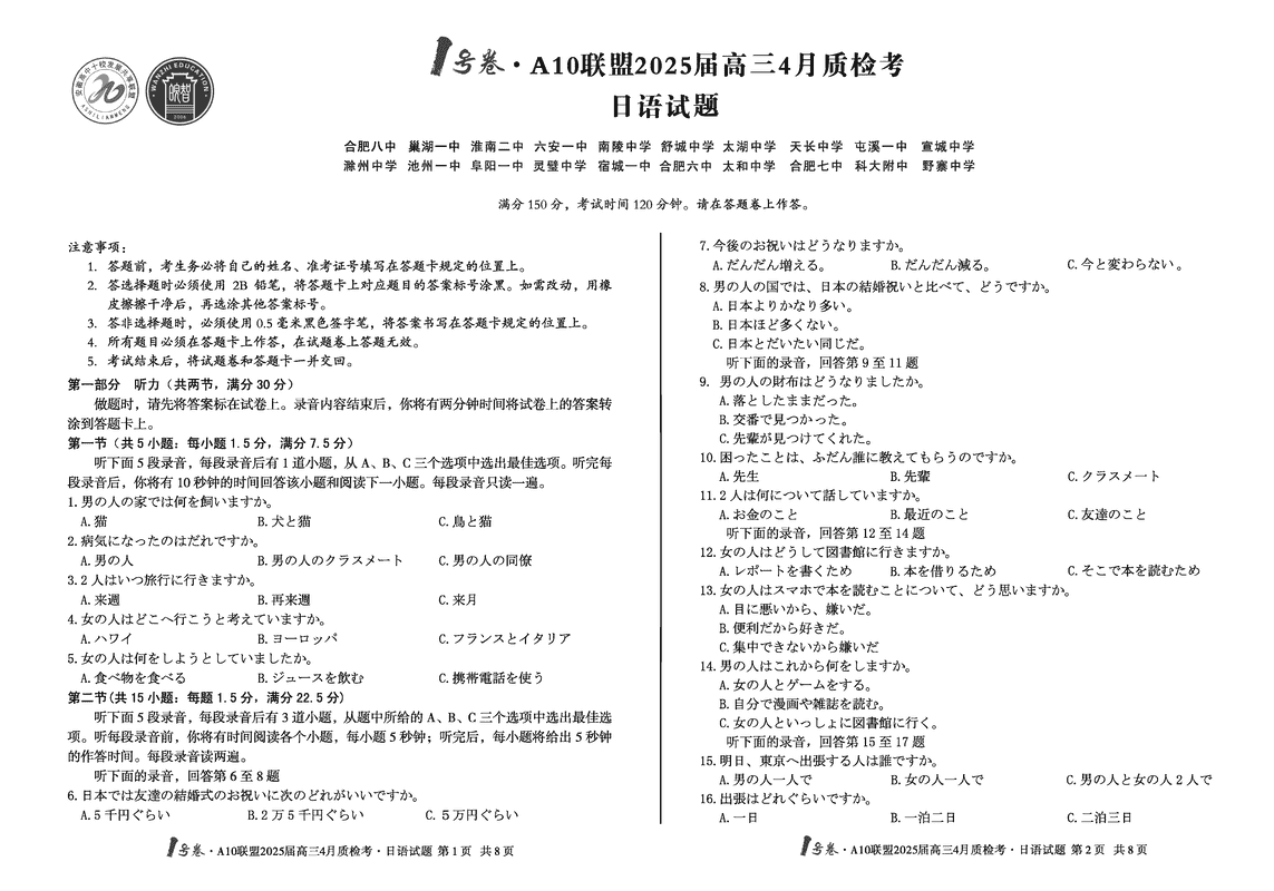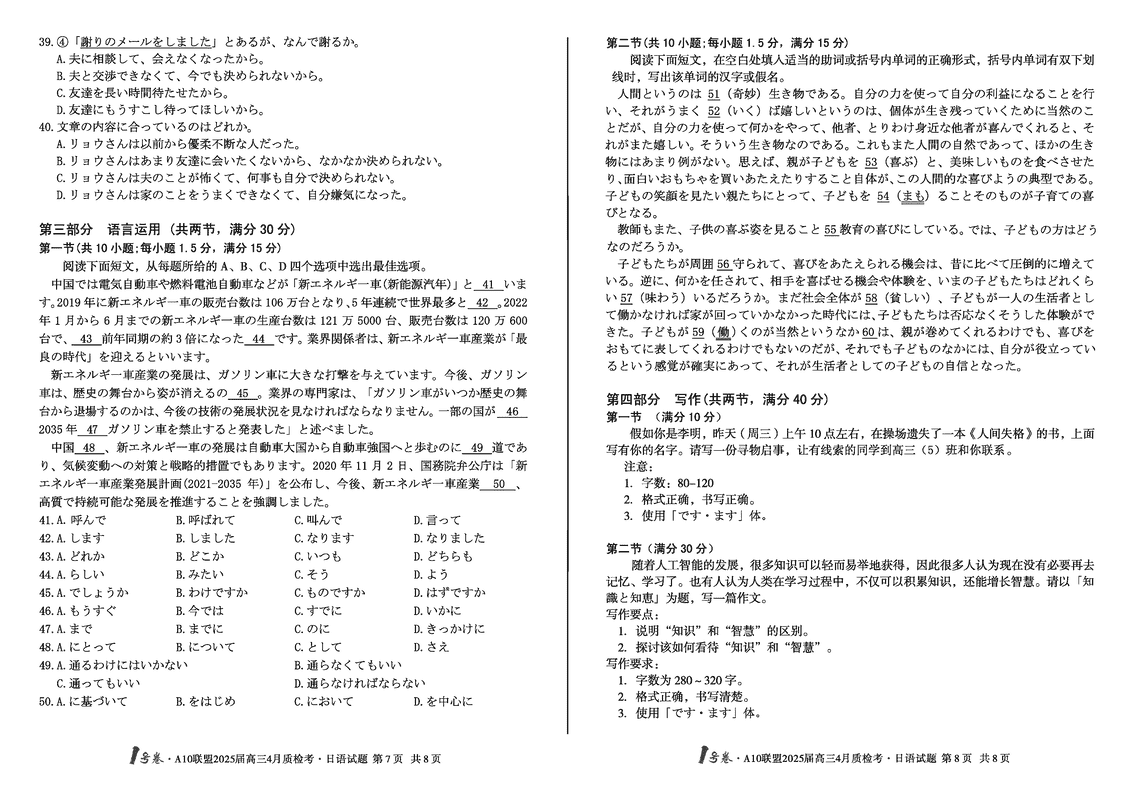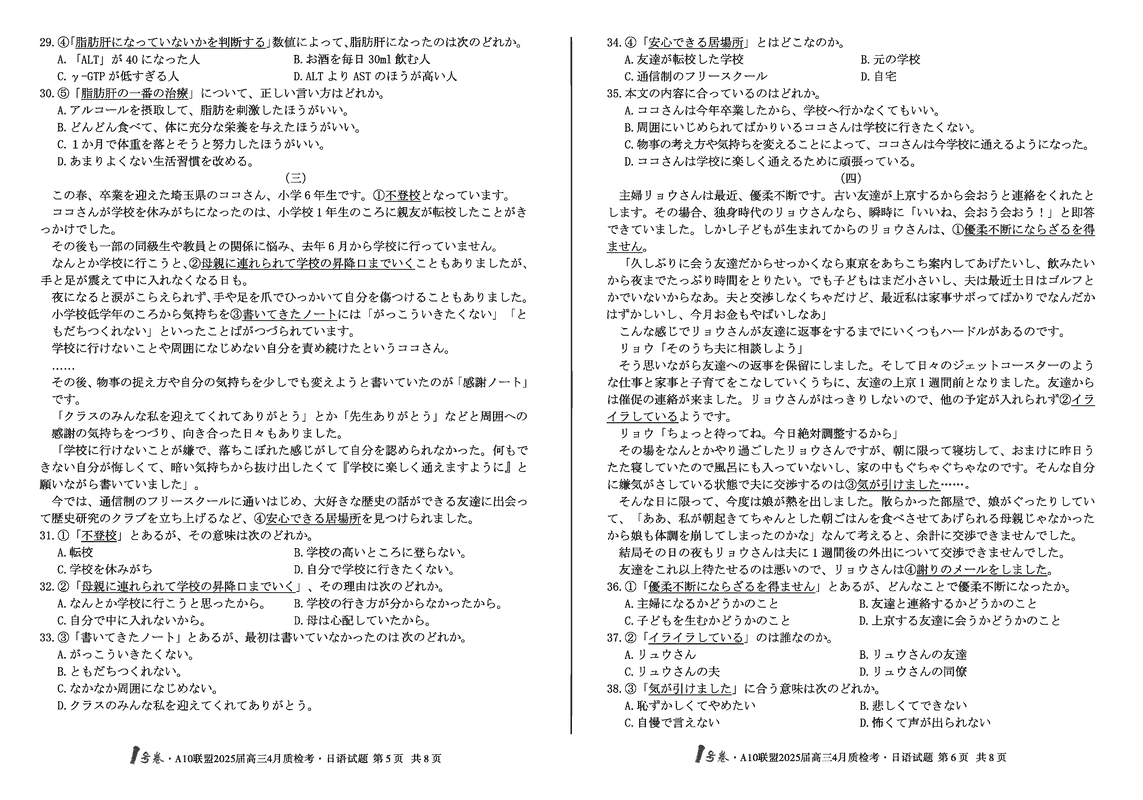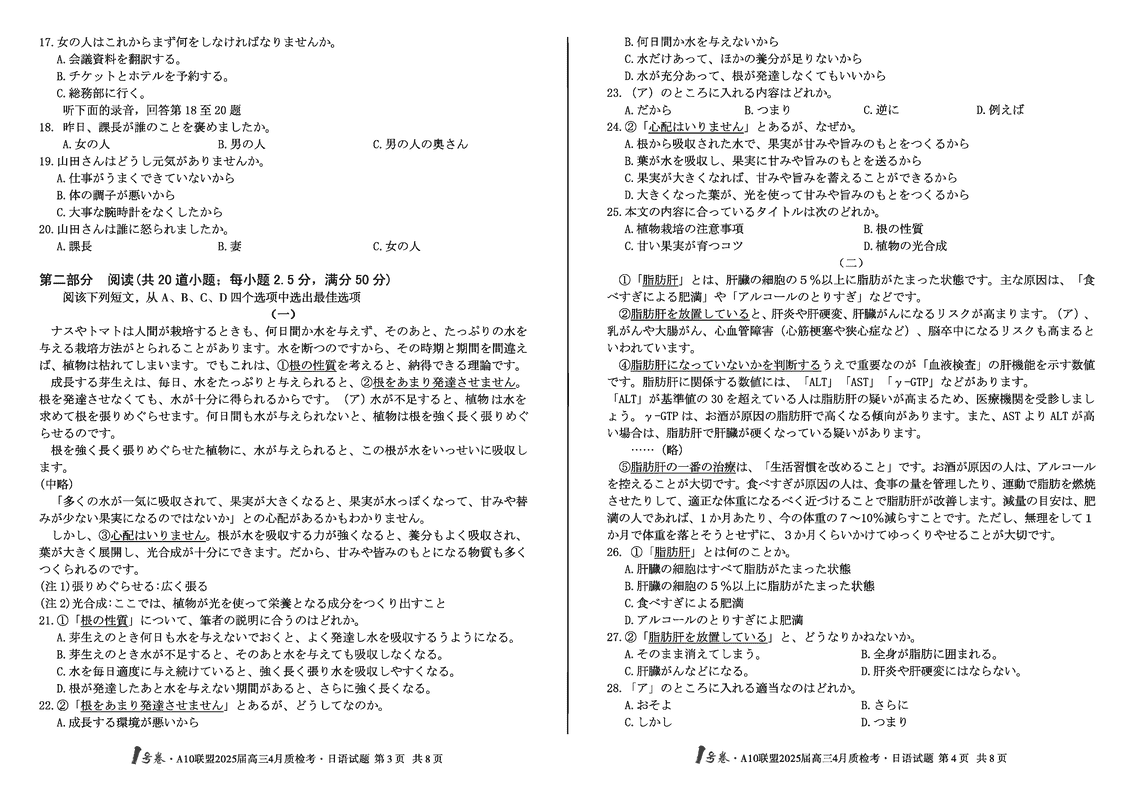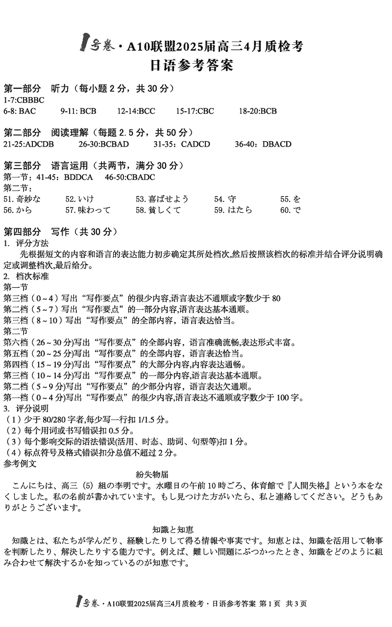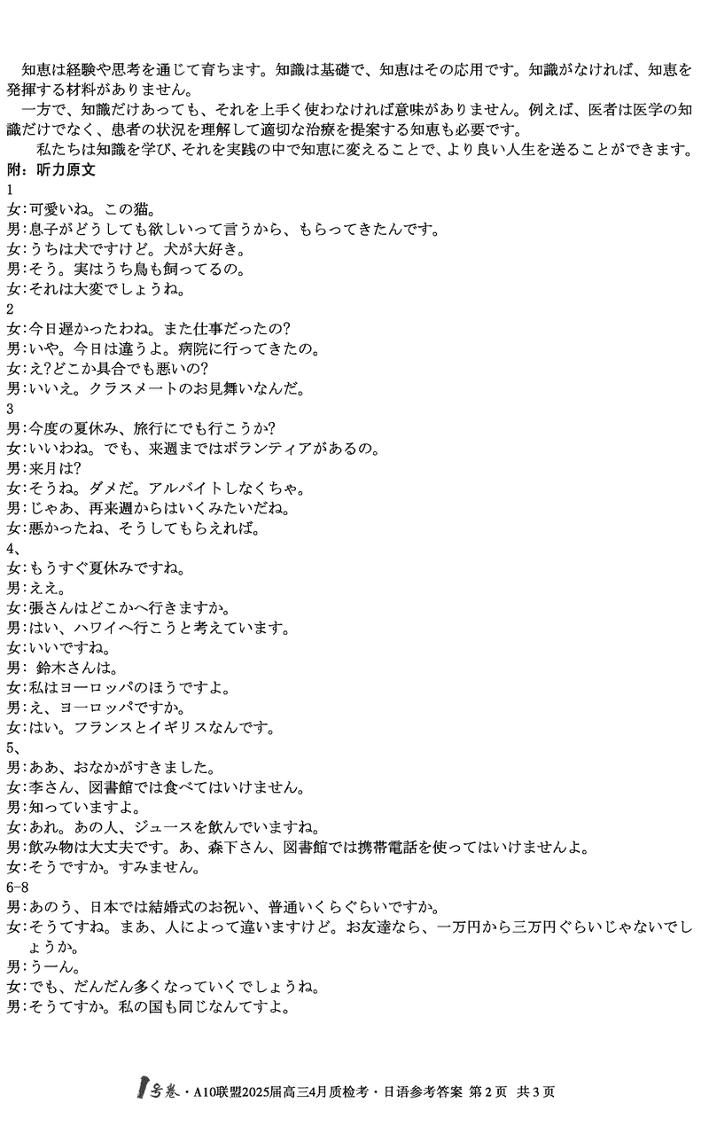 安徽省1号卷·A10联盟2025届高三4月质检日语试题及答案