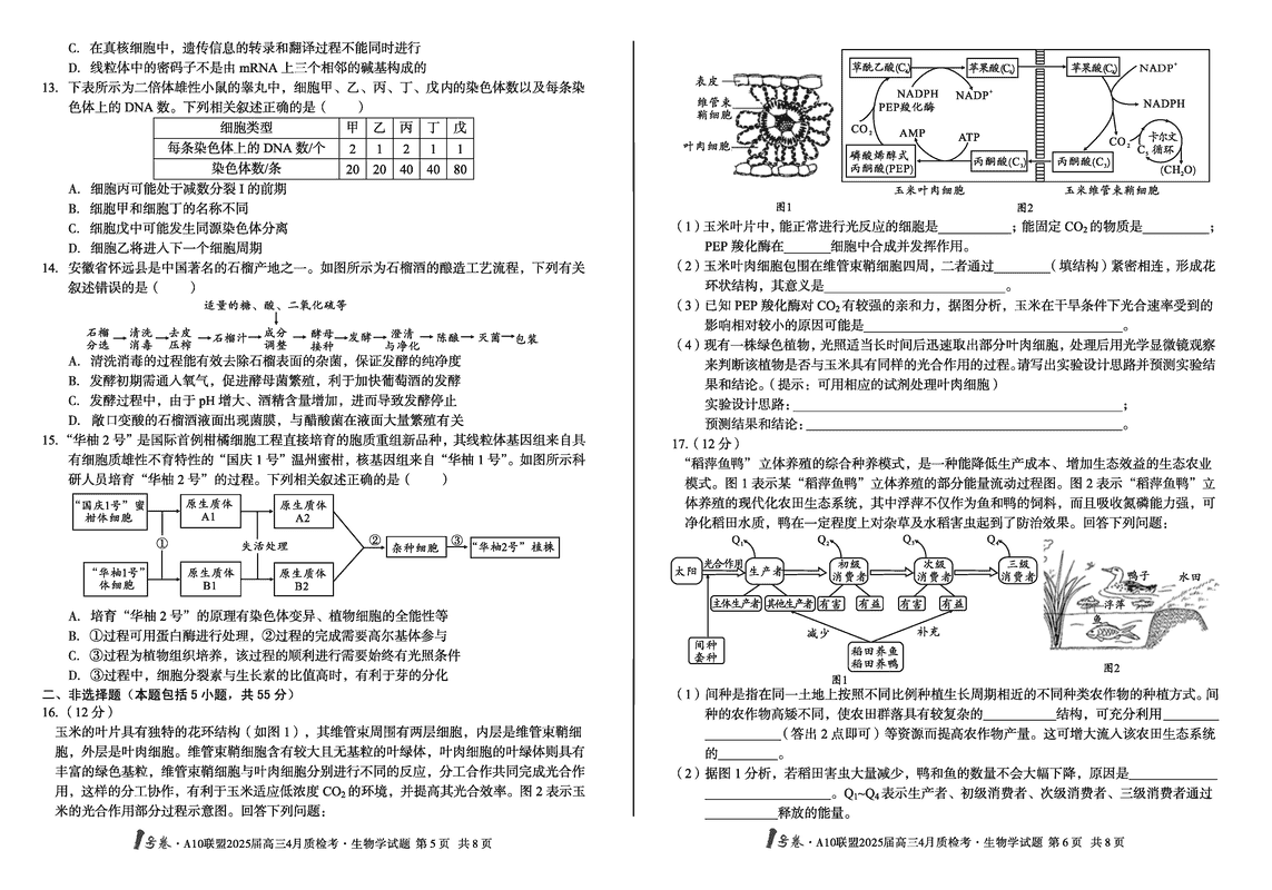 安徽省1号卷·A10联盟2025届高三4月质检生物试题及答案