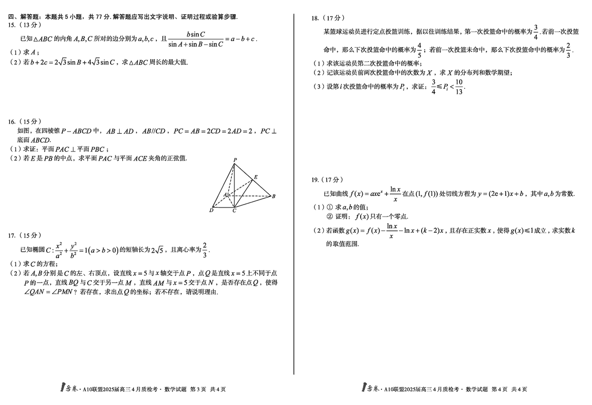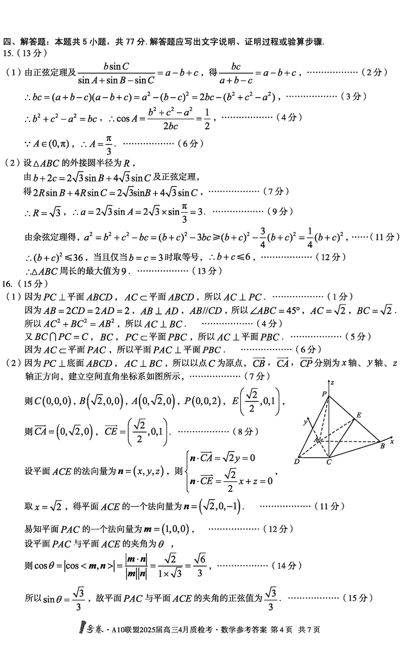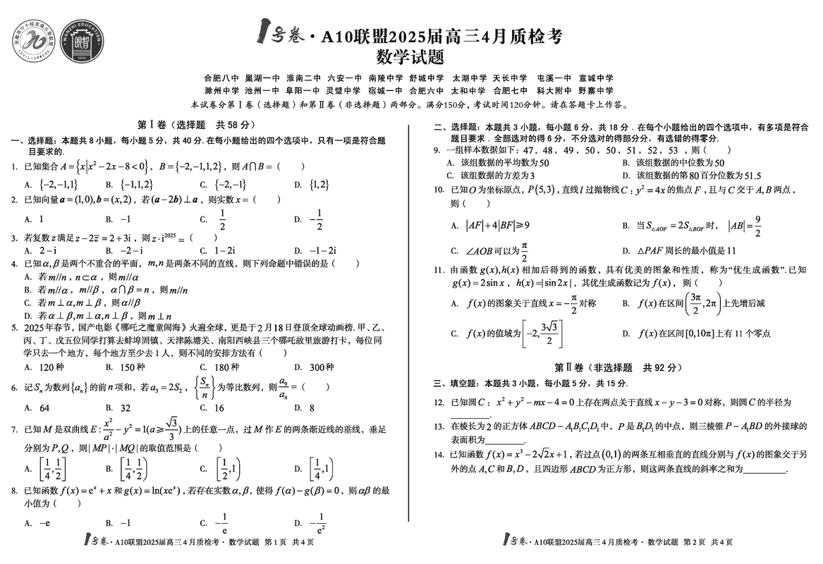 安徽省1号卷·A10联盟2025届高三4月质检数学试题及答案