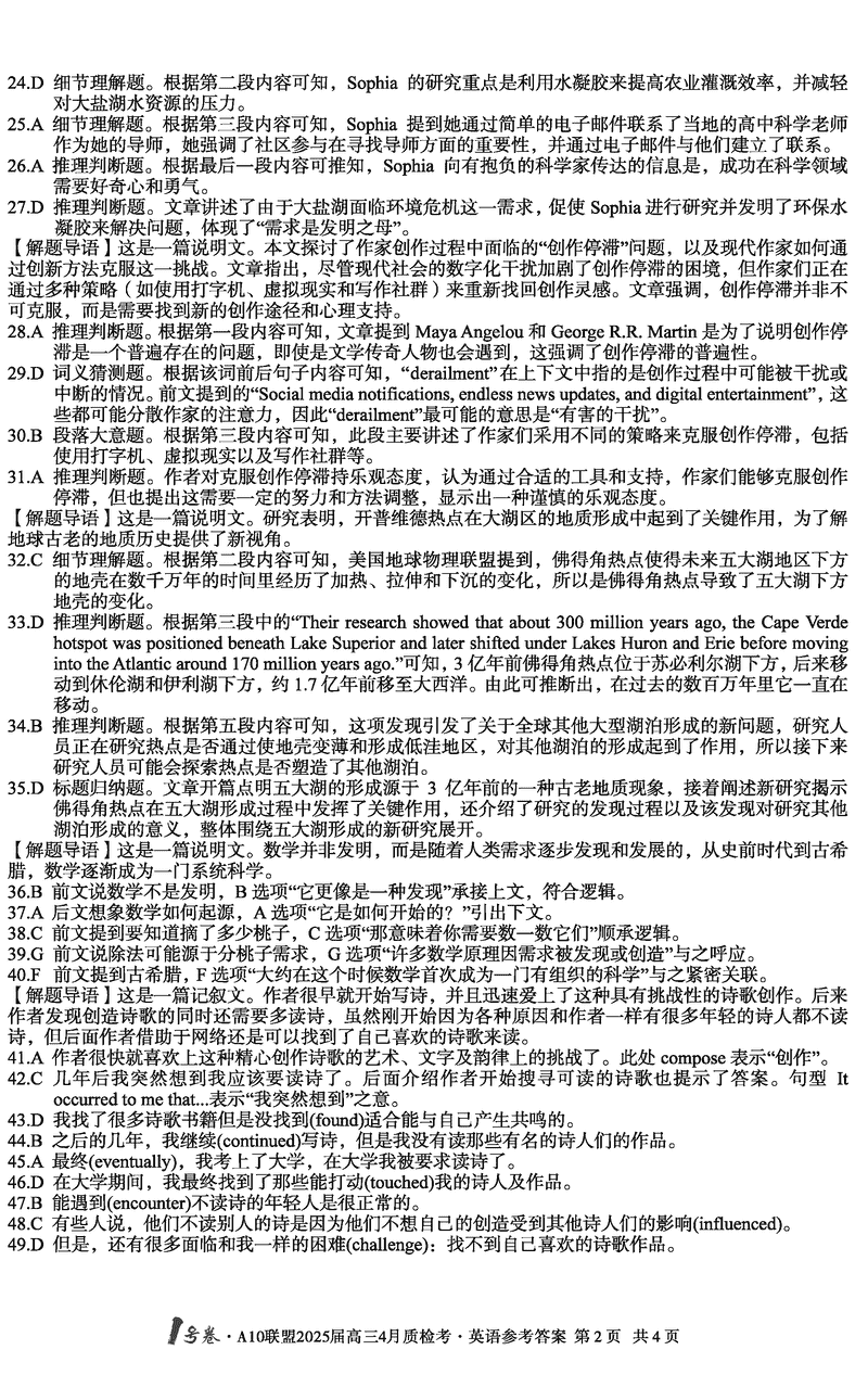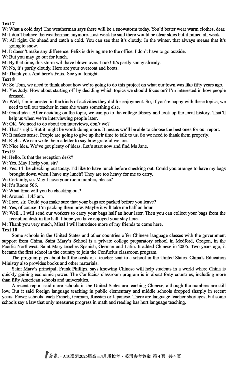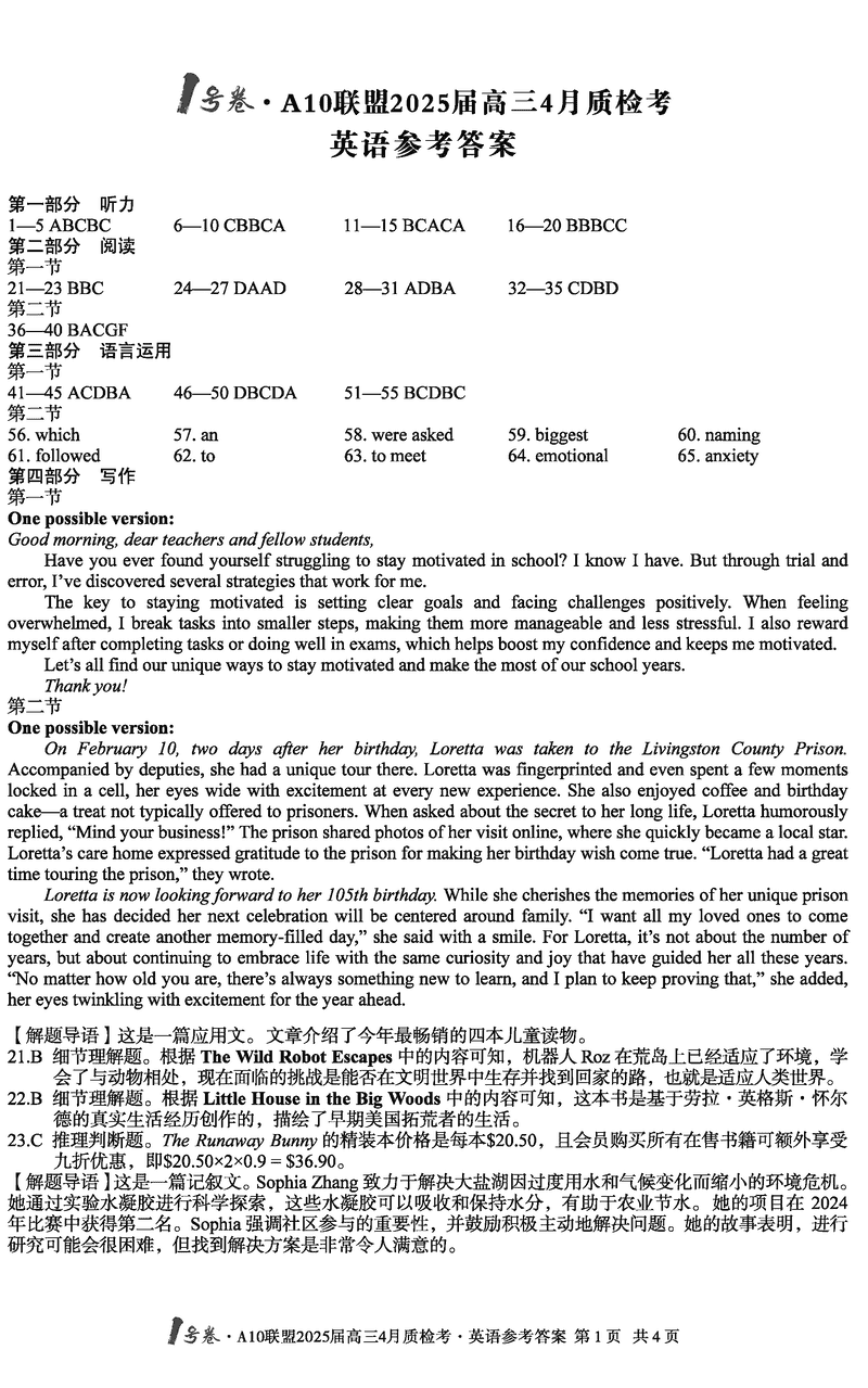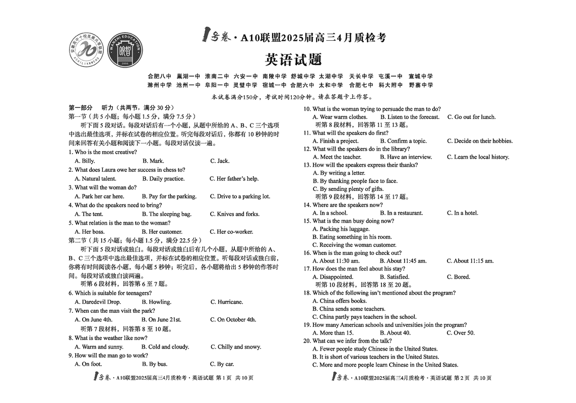 安徽省1号卷·A10联盟2025届高三4月质检英语试题及答案