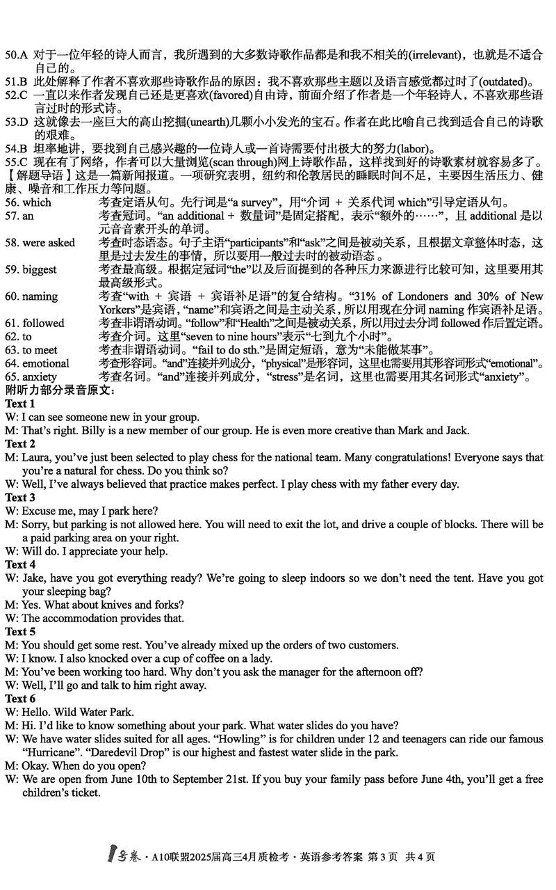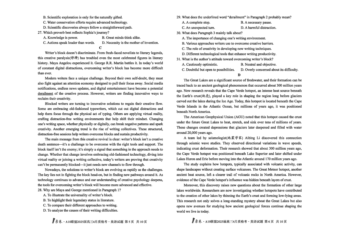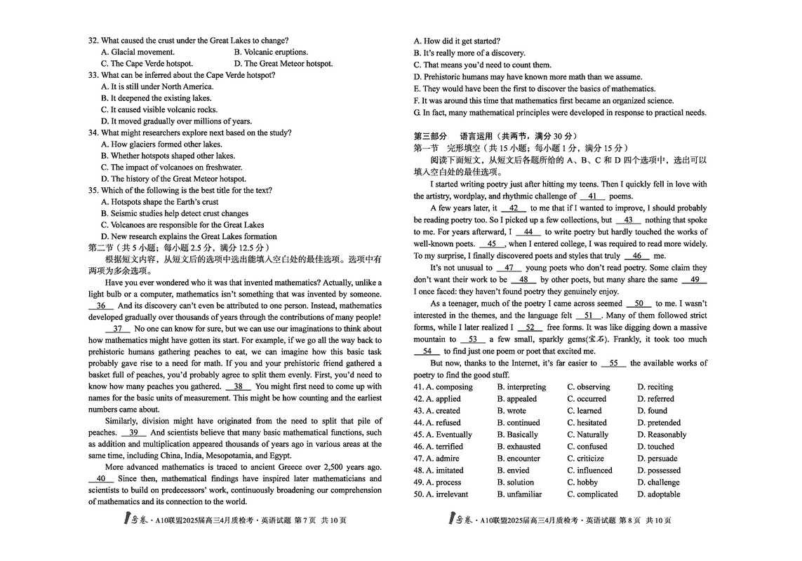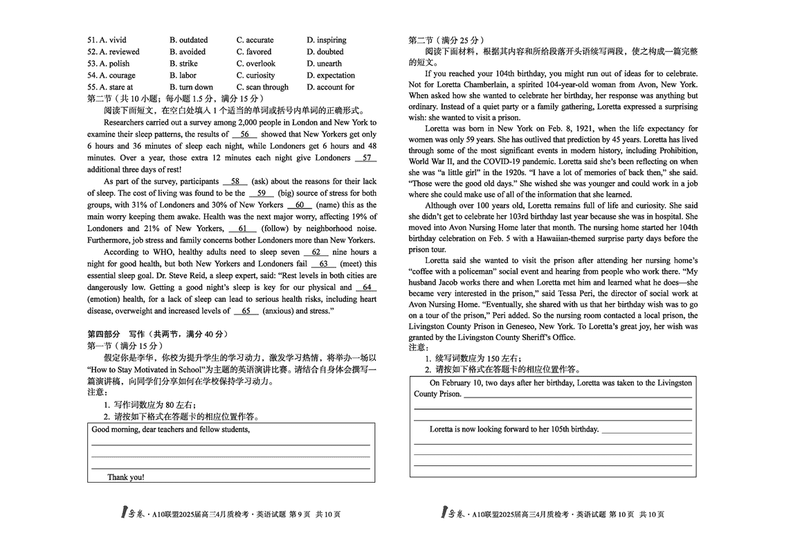 安徽省1号卷·A10联盟2025届高三4月质检英语试题及答案