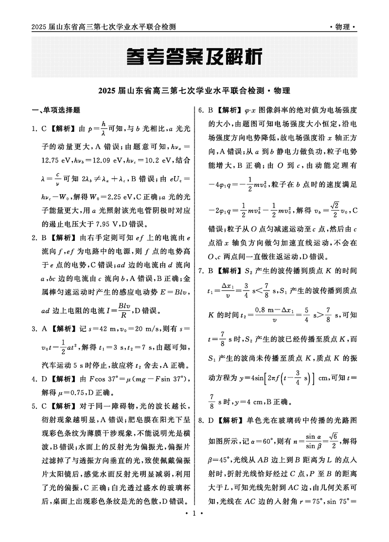 山东省齐鲁名校大联考2025届高三第七次学业水平联合检测物理考试已于近日开考,为方便考生考后及时查看考试情况,查漏补缺、弥补不足,本文整理了试题答案解析相关信息!