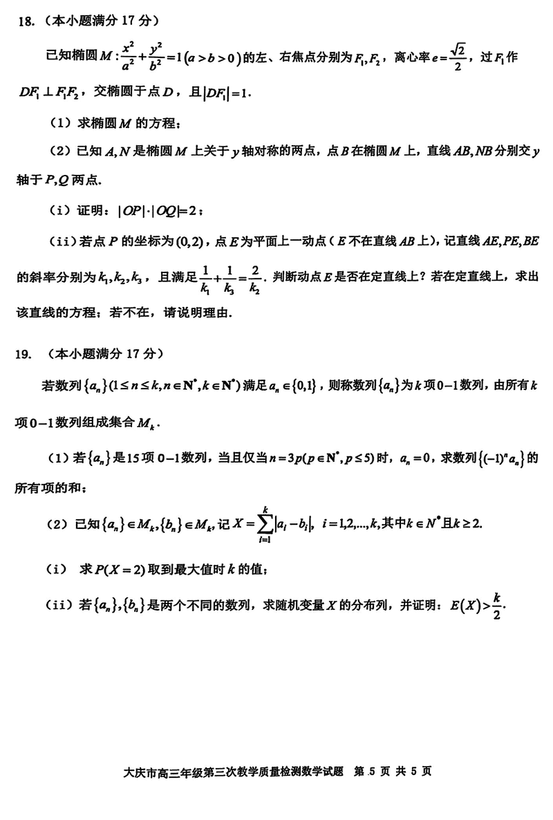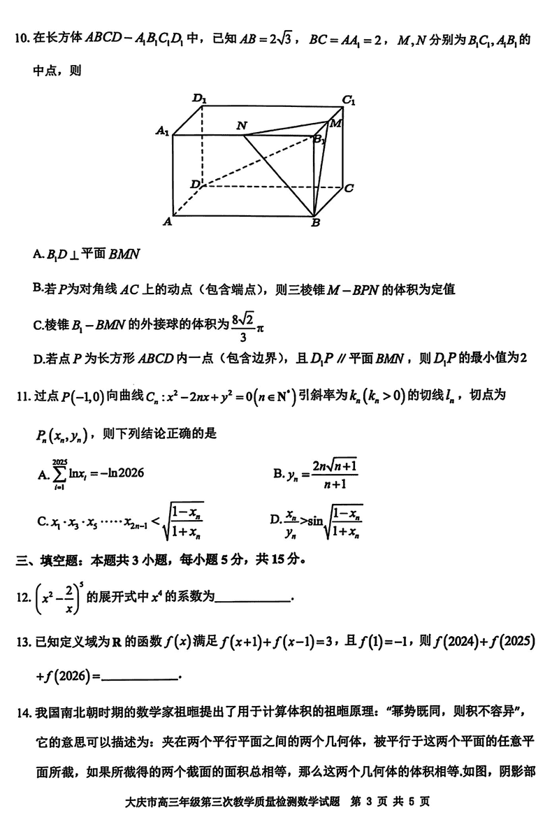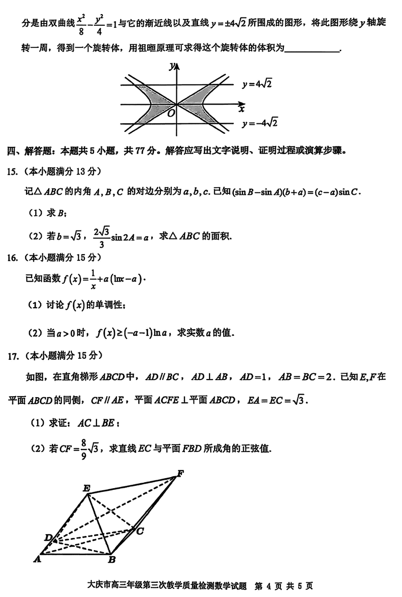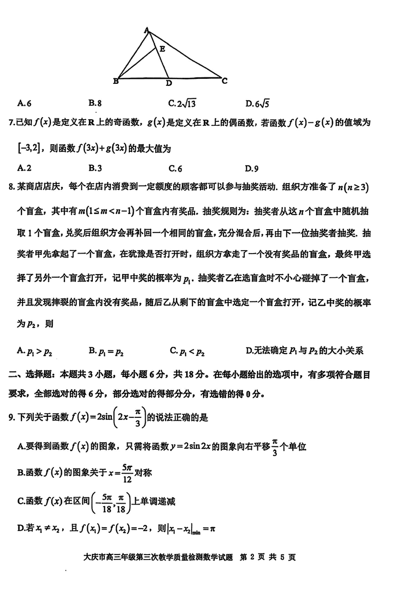 黑龙江大庆2025届高三下学期第三次模考数学试题及答案