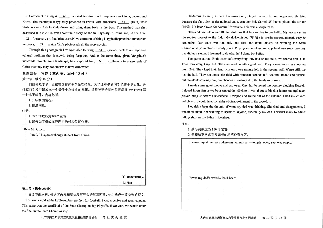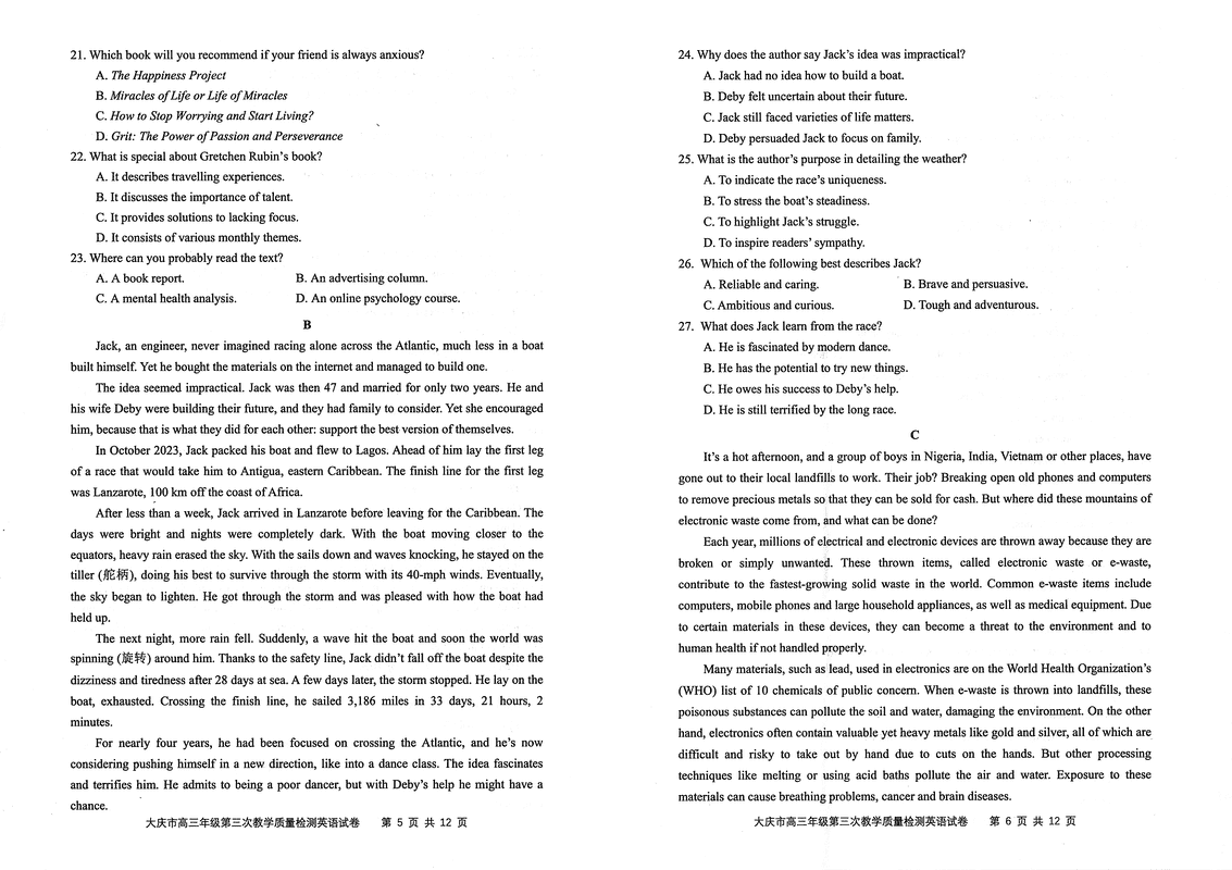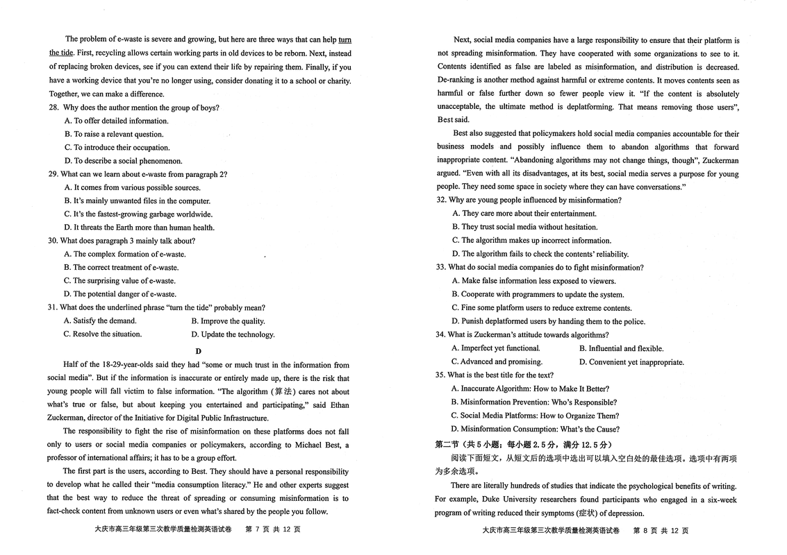 黑龙江大庆2025届高三下学期第三次模考英语试题及答案