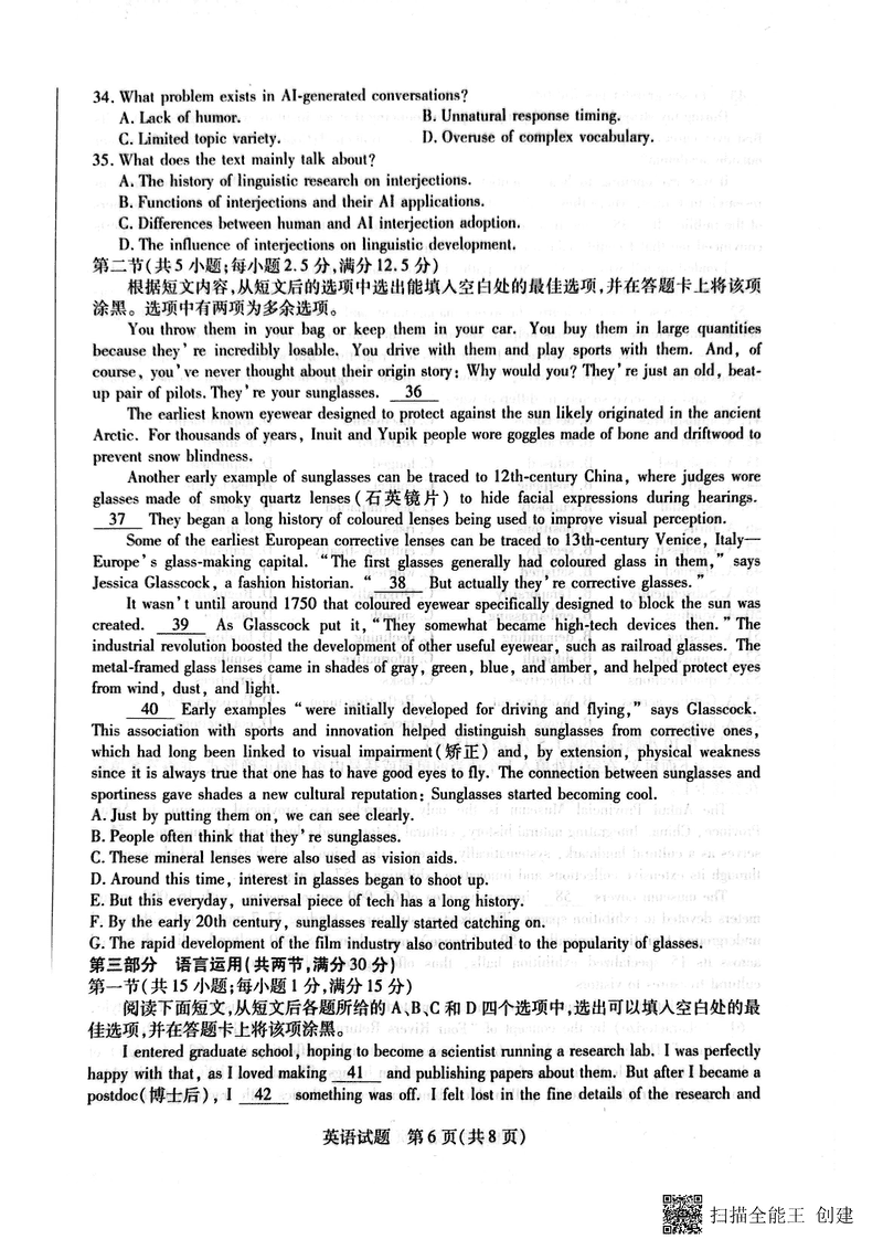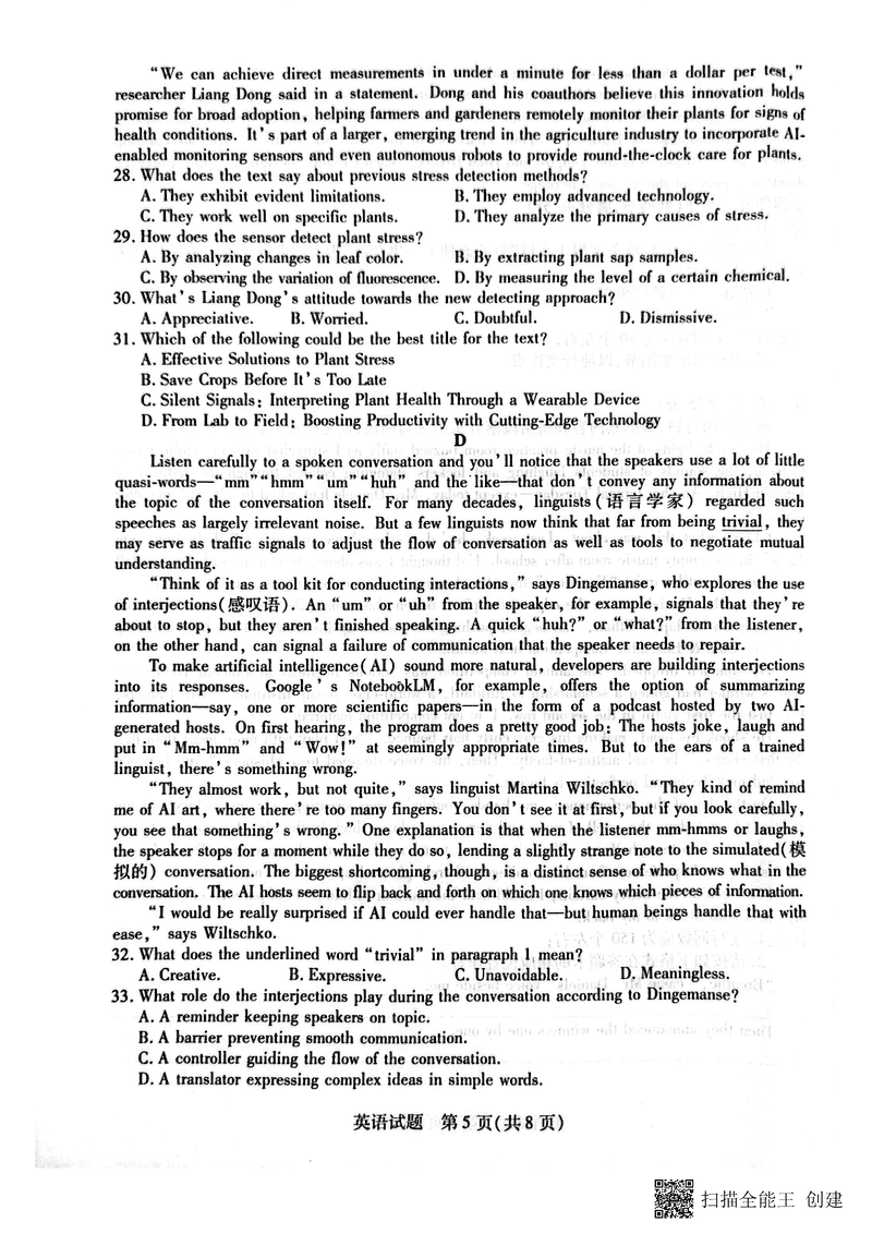 安徽卓越县中联2025年高三下学期5月检测英语试题及答案