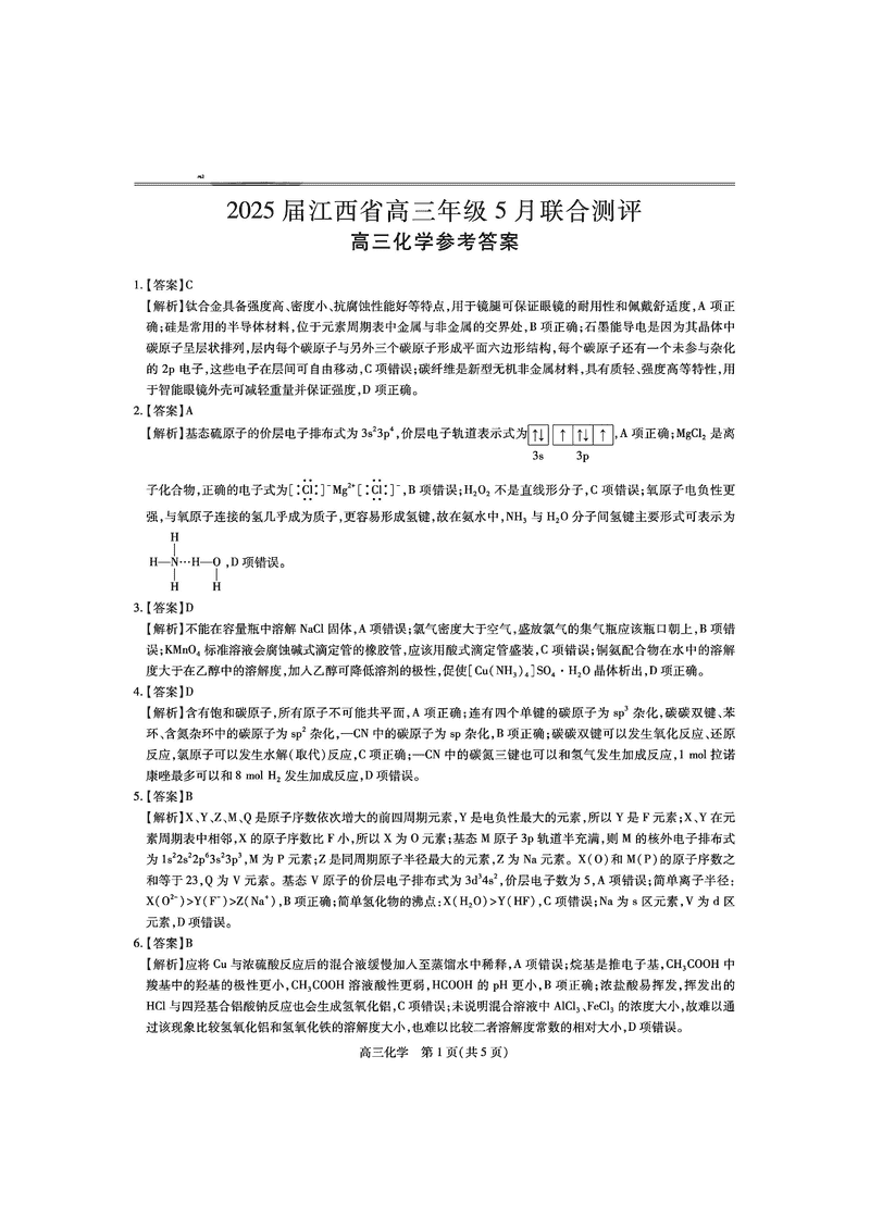 江西稳派上进联考2025届高三5月联合测评化学试题及答案