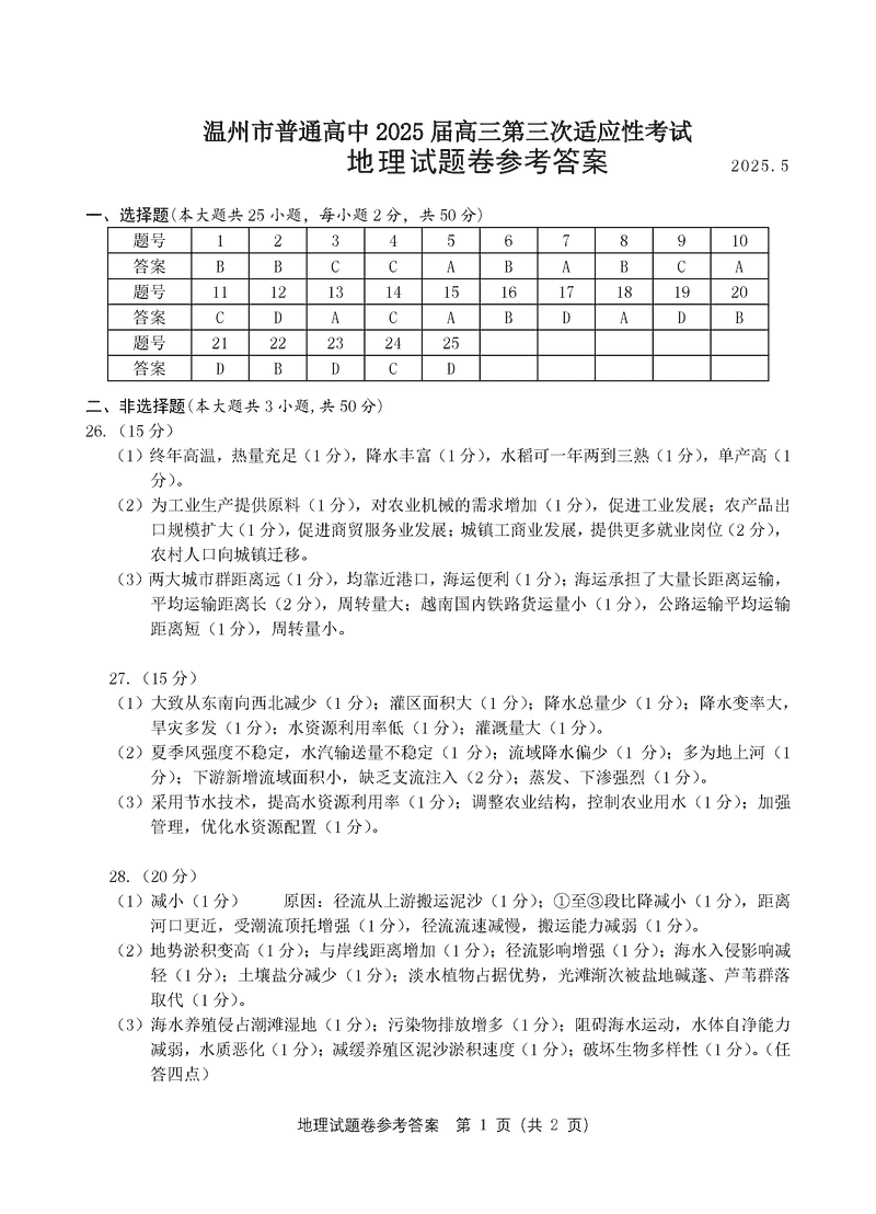 温州三模2025届高三第三次适应性考地理试题及答案 时间:2025-05-12 浙江 文综试题 温州三模2025届高三第三次适应性考地理考试已于近日开考,为方便考生考后及时查看考试情况,查漏补缺、弥补不足,本文整理了试题答案解析相关信息! 汇总:温州三模2025届高三第三次适应性考试试题及答案汇总 地理试题及答案解析