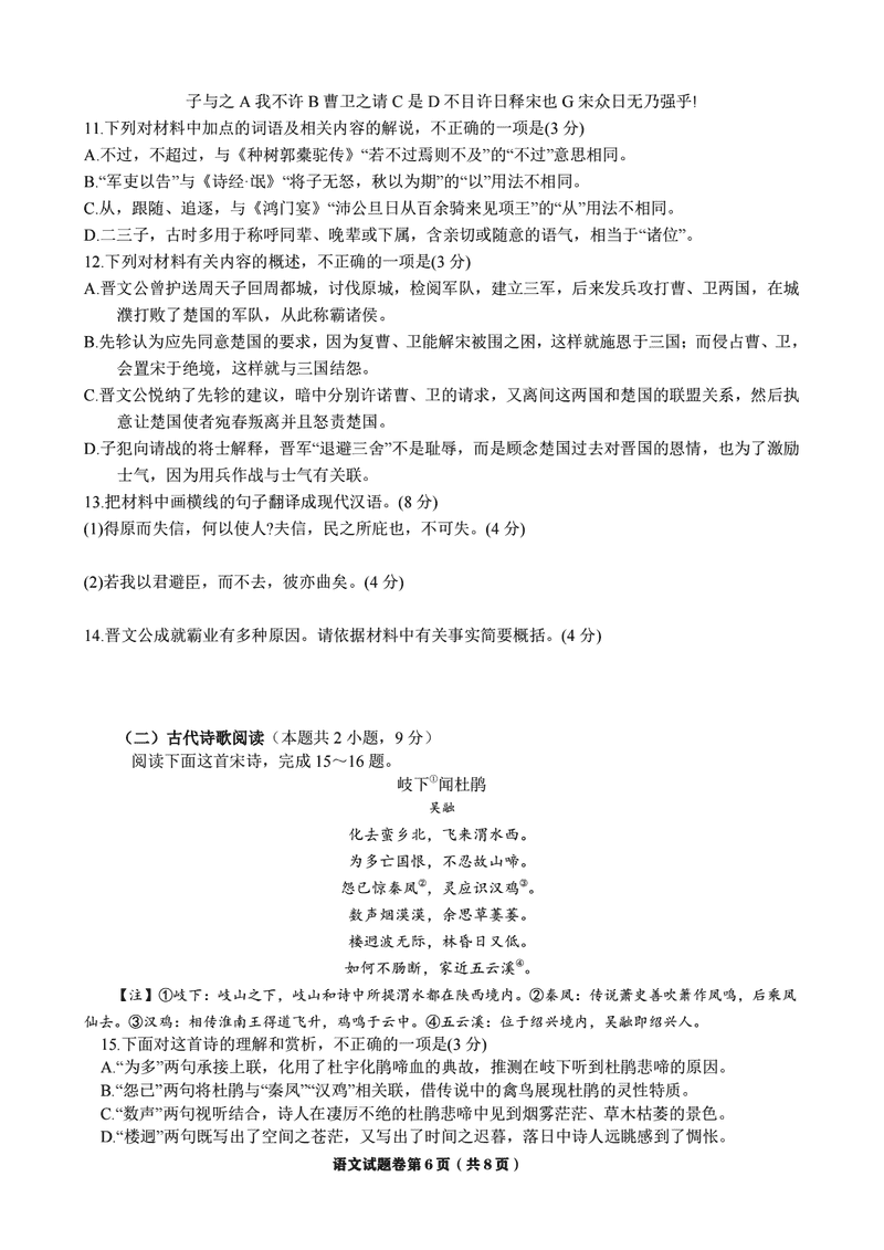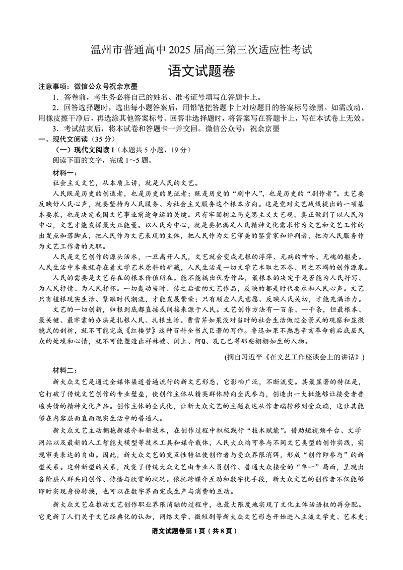 温州三模2025届高三第三次适应性考语文试题及答案 时间:2025-05-12 浙江 语文试题 温州三模2025届高三第三次适应性考语文考试已于近日开考,为方便考生考后及时查看考试情况,查漏补缺、弥补不足,本文整理了试题答案解析相关信息! 汇总:温州三模2025届高三第三次适应性考试试题及答案汇总 语文试题及答案解析