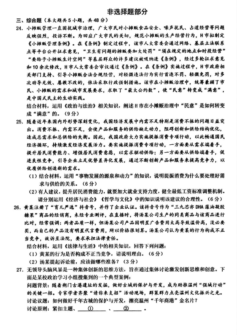 温州三模2025届高三第三次适应性考政治试题及答案 时间:2025-05-12 浙江 文综试题 温州三模2025届高三第三次适应性考政治考试已于近日开考,为方便考生考后及时查看考试情况,查漏补缺、弥补不足,本文整理了试题答案解析相关信息! 汇总:温州三模2025届高三第三次适应性考试试题及答案汇总 政治试题及答案解析