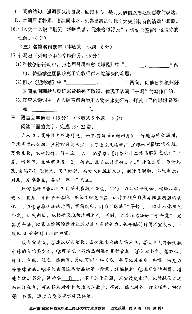 漳州四检2025届高三第四次教学质检语文试题及答案
