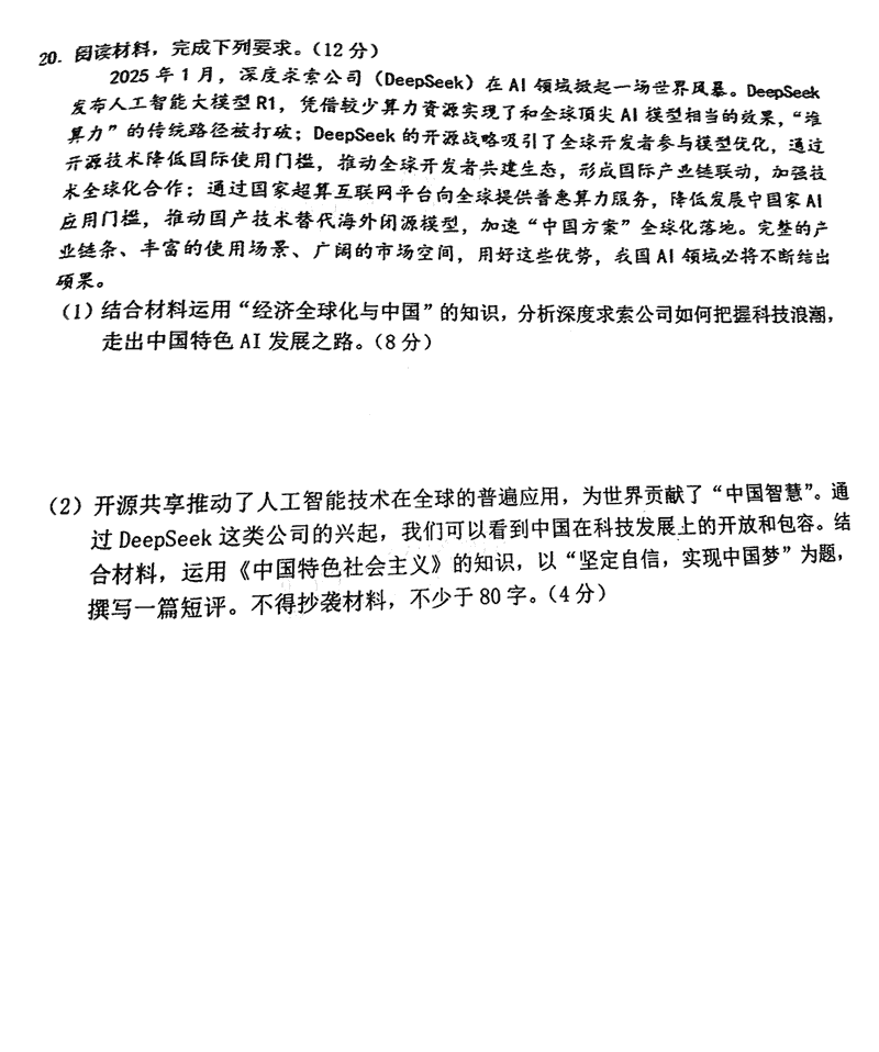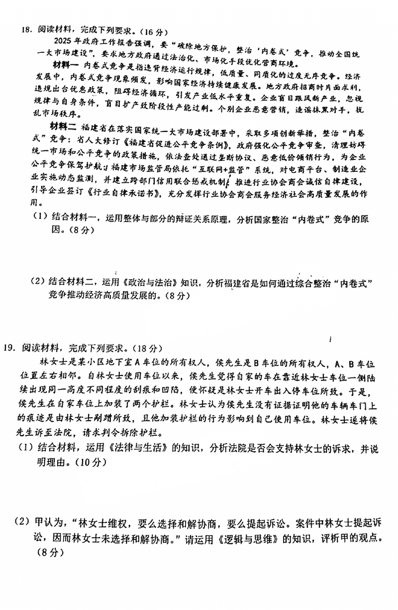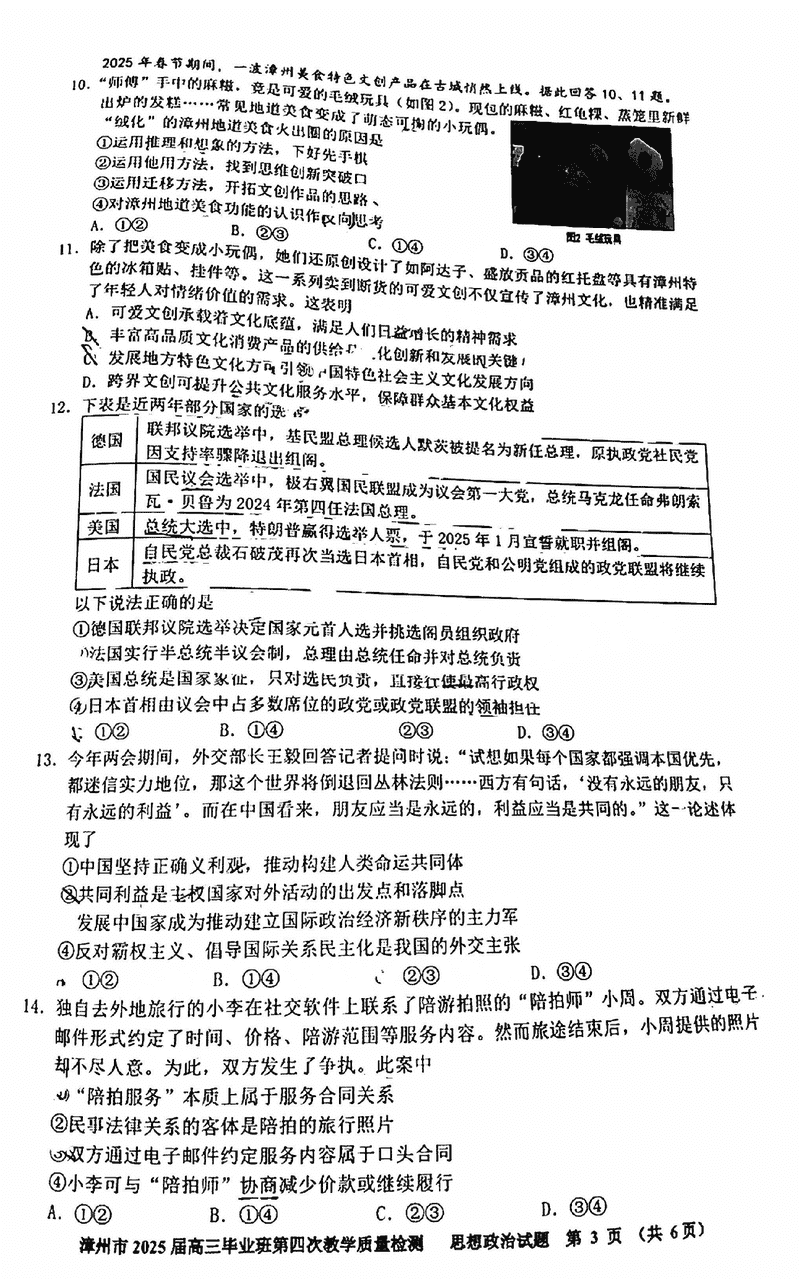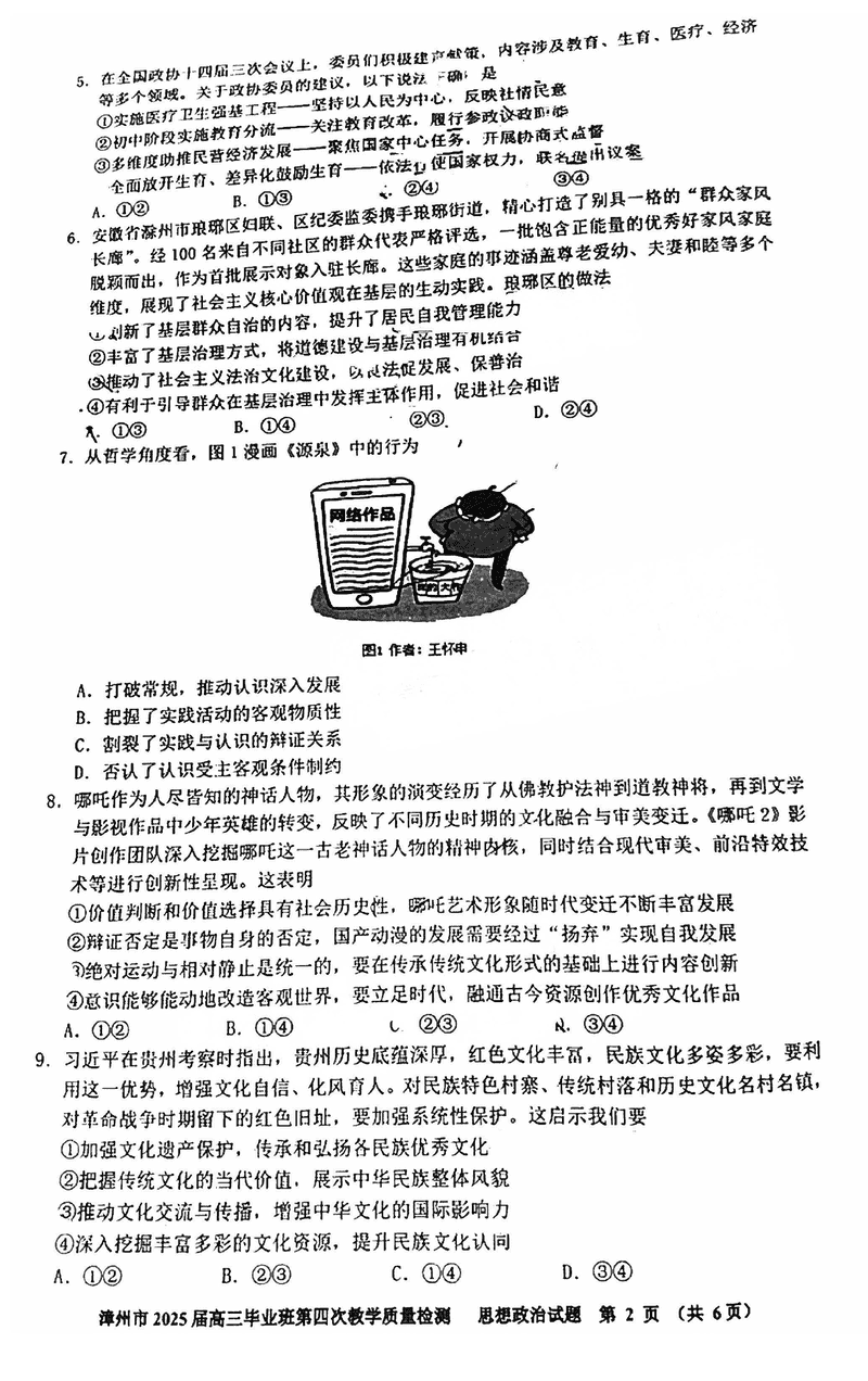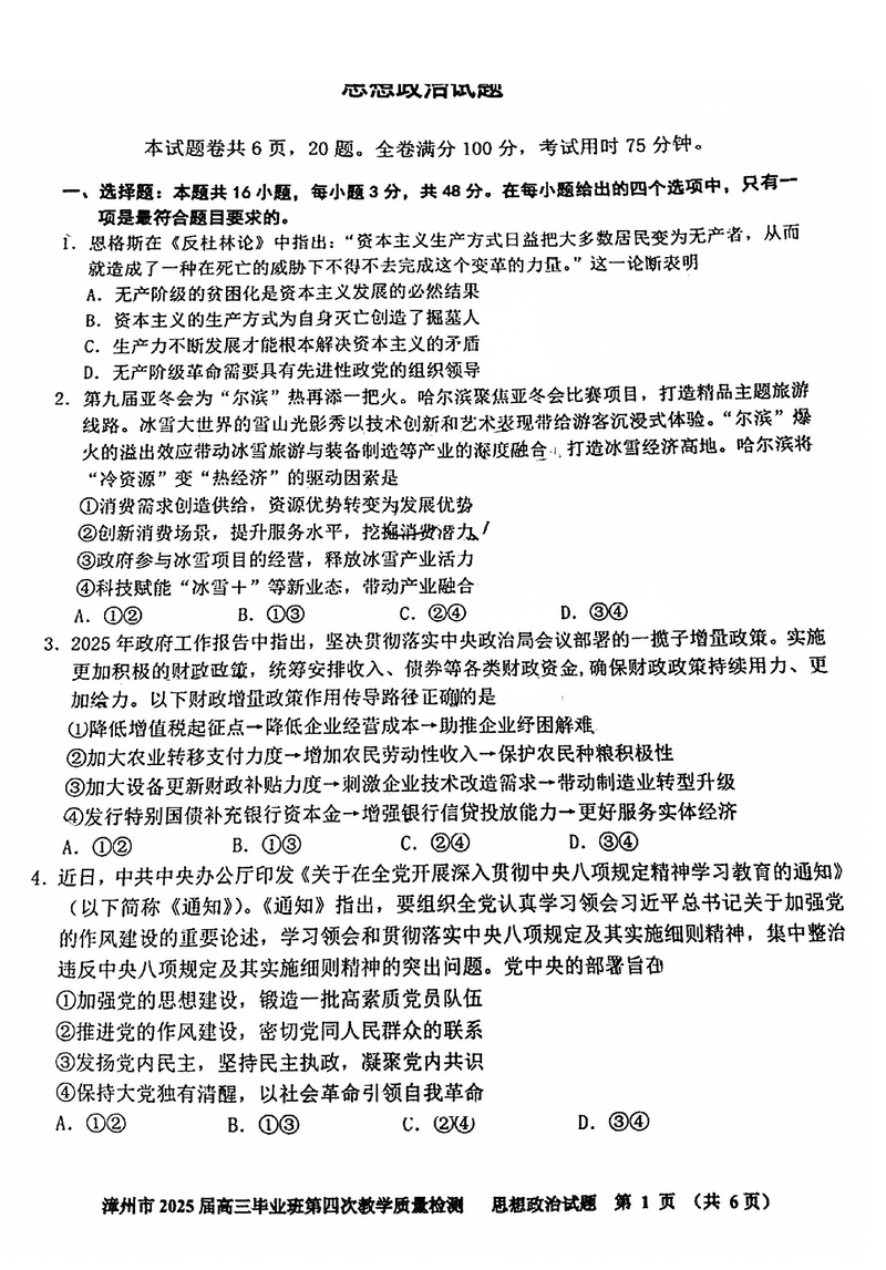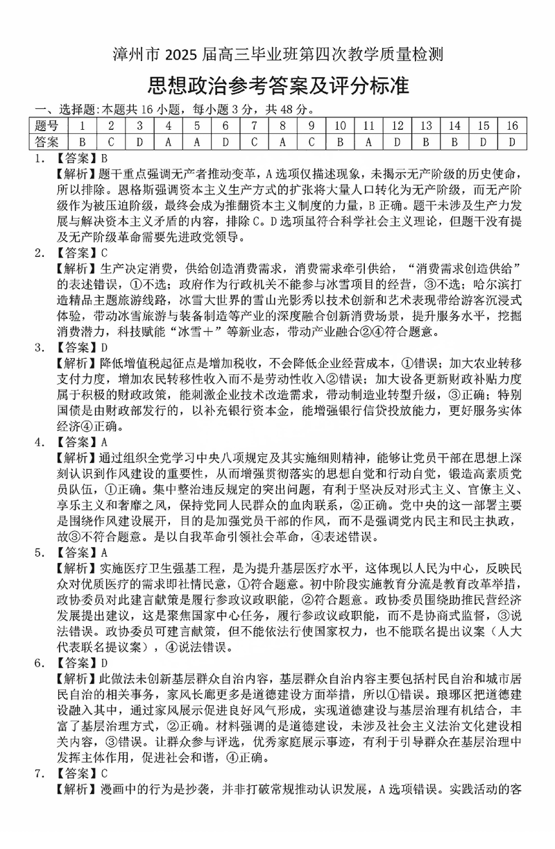 漳州四检2025届高三第四次教学质检政治试题及答案
