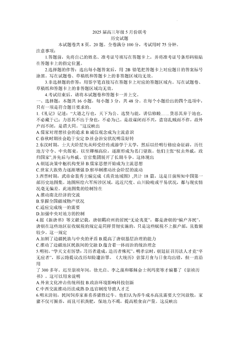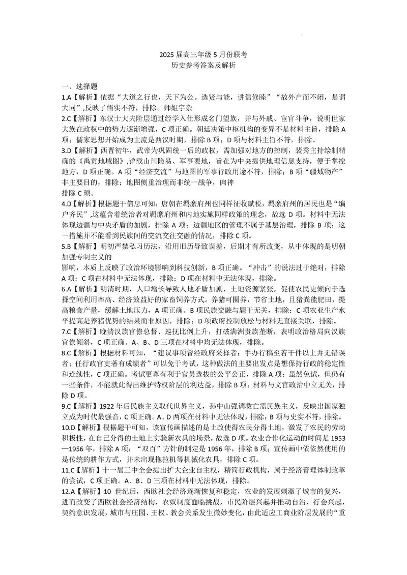 衡水金卷2025届高三年级5月联考历史试题及答案