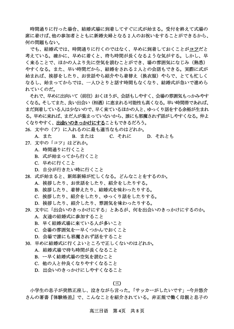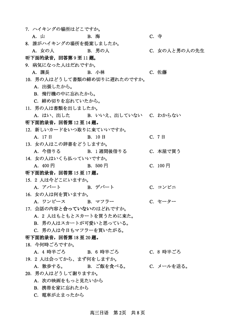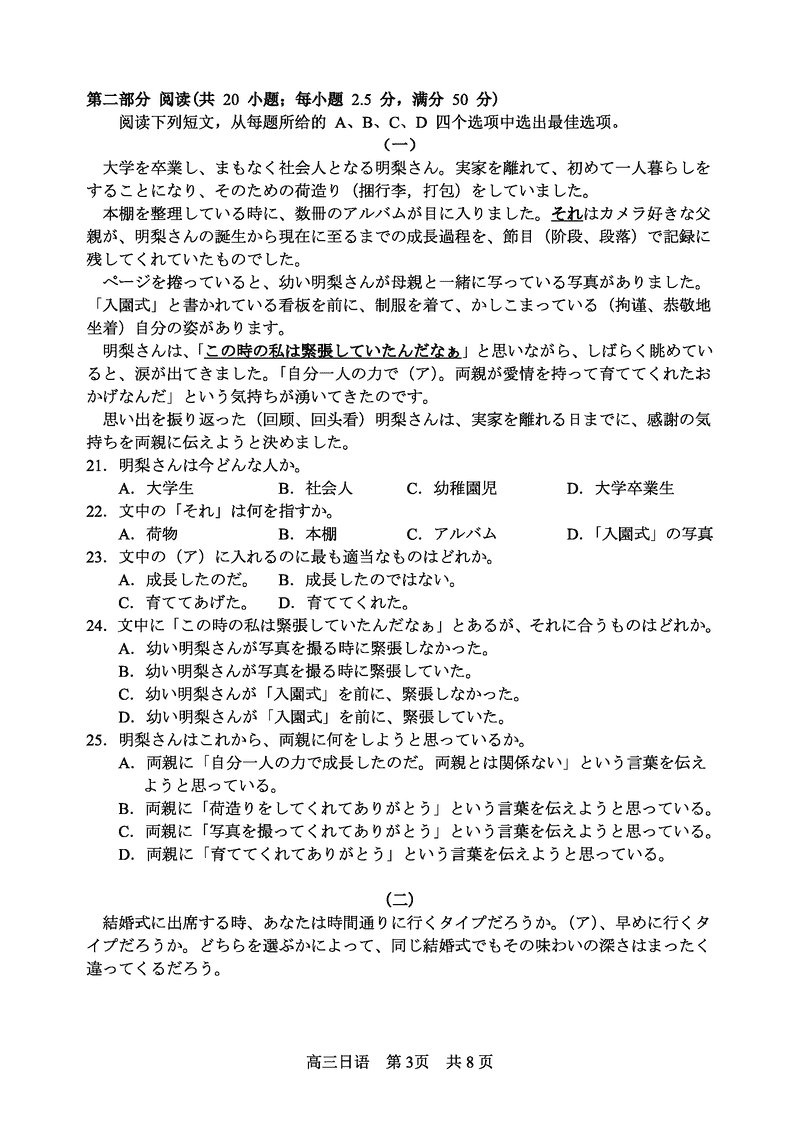 攀枝花三统2025届高三第三次统考日语试题及答案 时间:2025-05-15 四川 英语试题 攀枝花三统2025届高三第三次统考日语考试已于近日开考,为方便考生考后及时查看考试情况,查漏补缺、弥补不足,本文整理了试题答案解析相关信息! 汇总:攀枝花三统2025届高三第三次统考试题及答案汇总 日语试题及答案解析