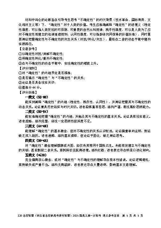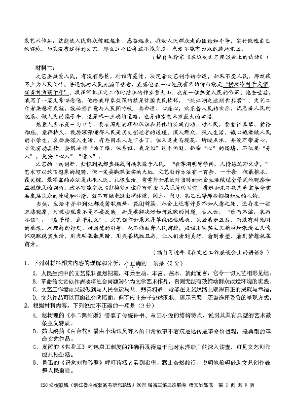 浙江Z20名校联盟2025届高三第三次联考语文试题及答案