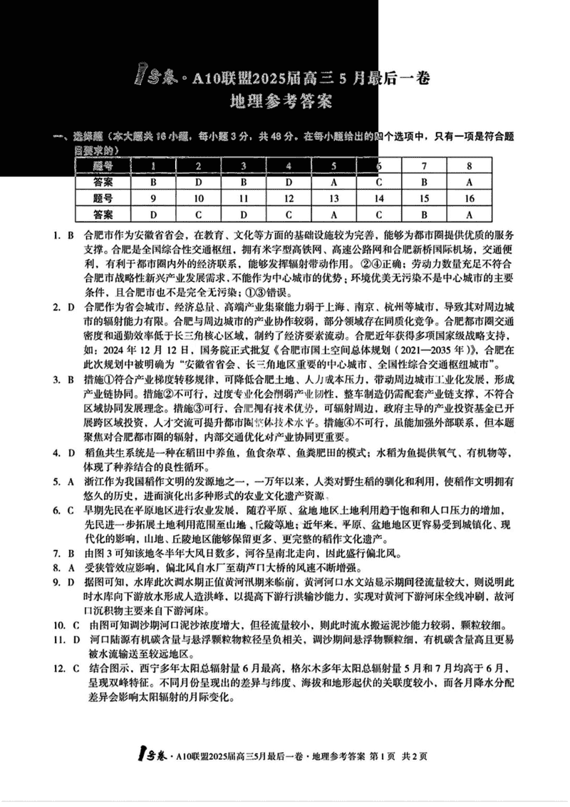 安徽A10联盟2025届高三最后一卷地理试题及答案