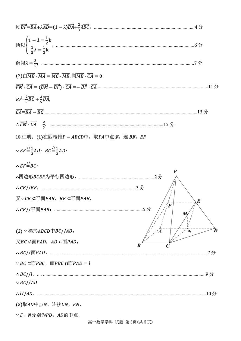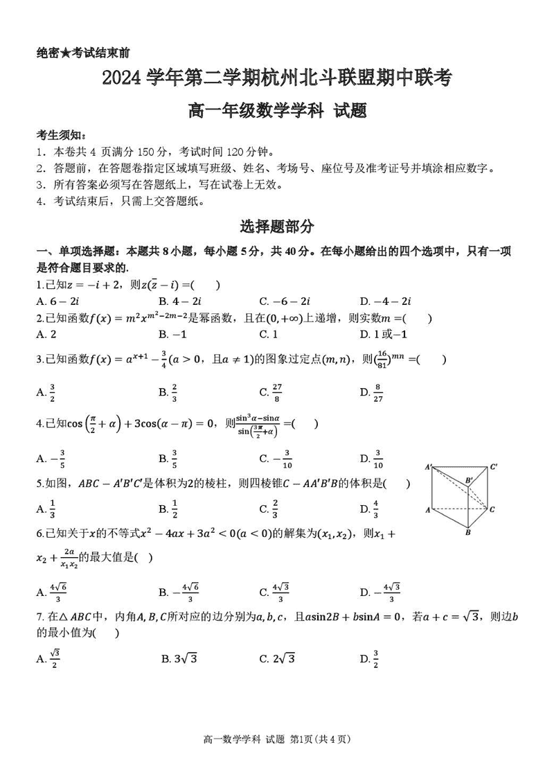 杭州北斗联盟2024-2025学年高一下4月期中联考数学试题及答案