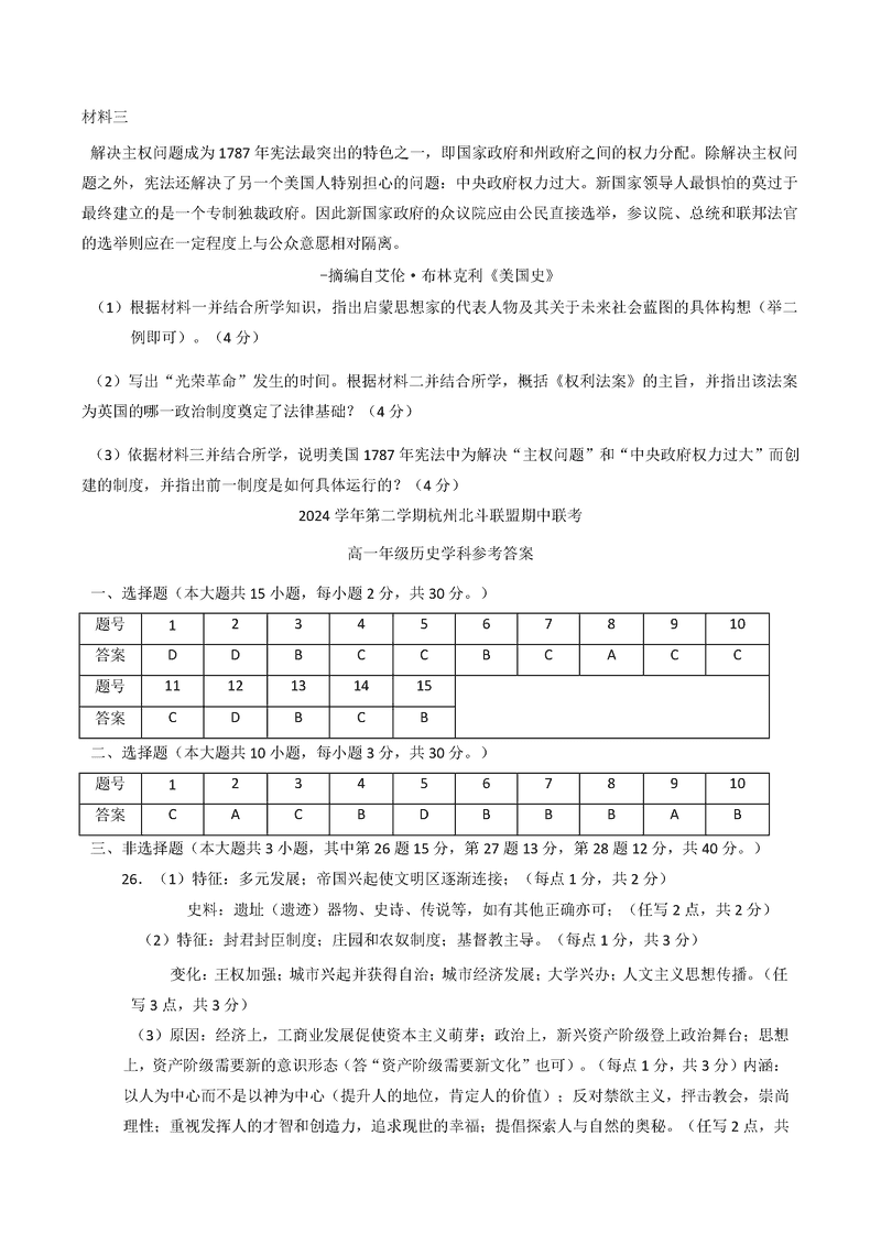 杭州北斗联盟2024-2025学年高一下4月期中联考历史试题及答案