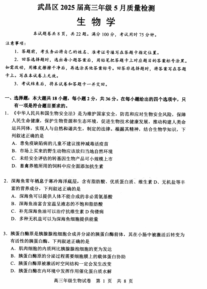 武汉武昌区2025届高三5月质量检测生物试题及答案 时间:2025-05-19 湖北 理综试题 湖北省武昌区2025届高三5月质量检测生物考试已于近日开考,为方便考生考后及时查看考试情况,查漏补缺、弥补不足,本文整理了试题答案解析相关信息! 汇总:湖北省武昌区2025届高三5月质量检测试题及答案汇总 生物试题及答案解析