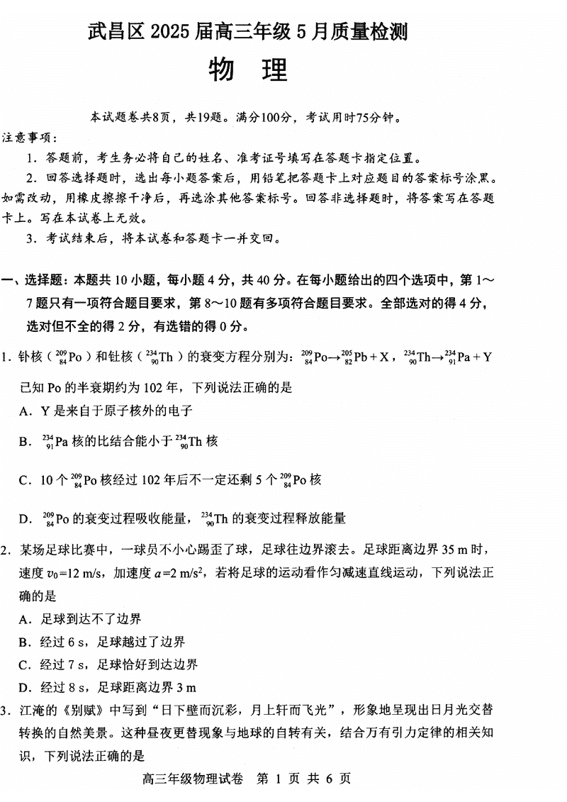 武汉武昌区2025届高三5月质量检测物理试题及答案 时间:2025-05-19 湖北 理综试题 湖北省武昌区2025届高三5月质量检测物理考试已于近日开考,为方便考生考后及时查看考试情况,查漏补缺、弥补不足,本文整理了试题答案解析相关信息! 汇总:湖北省武昌区2025届高三5月质量检测试题及答案汇总 物理试题及答案解析