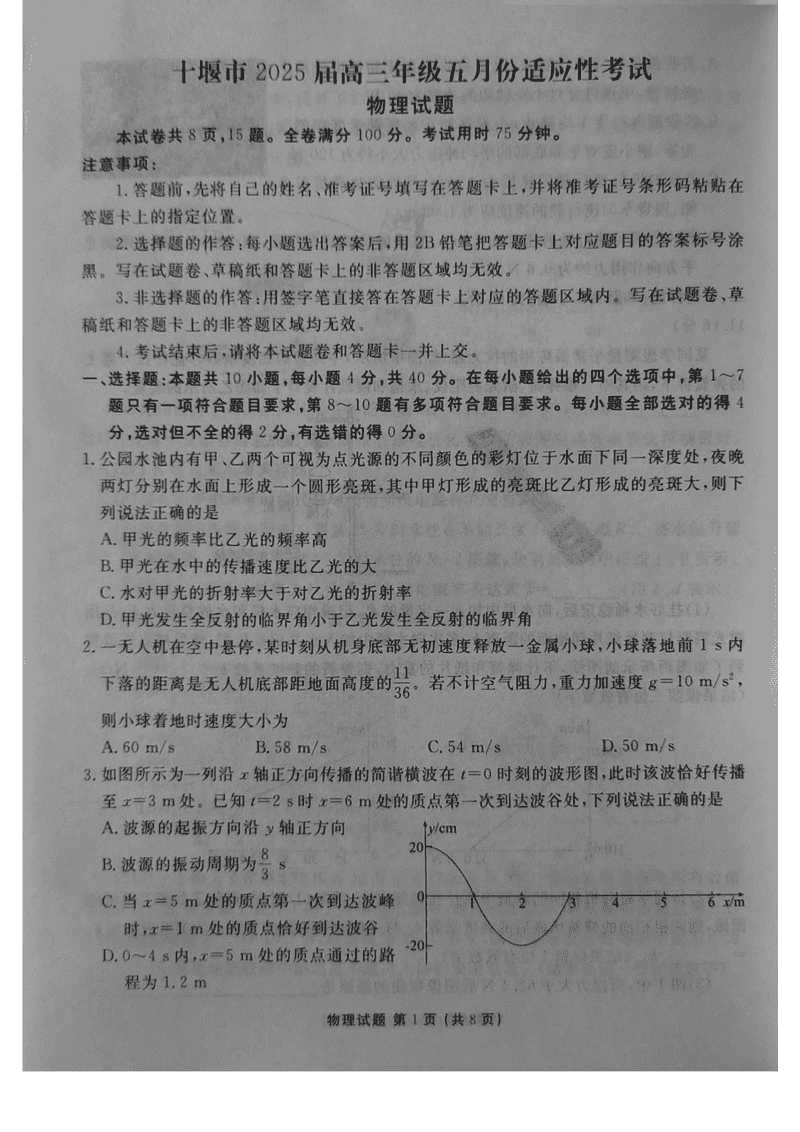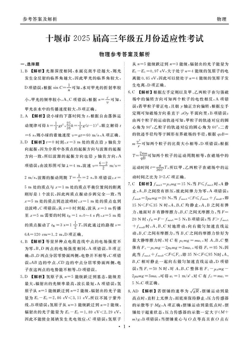 十堰市2025届高三下学期五月份适应性物理试题及答案