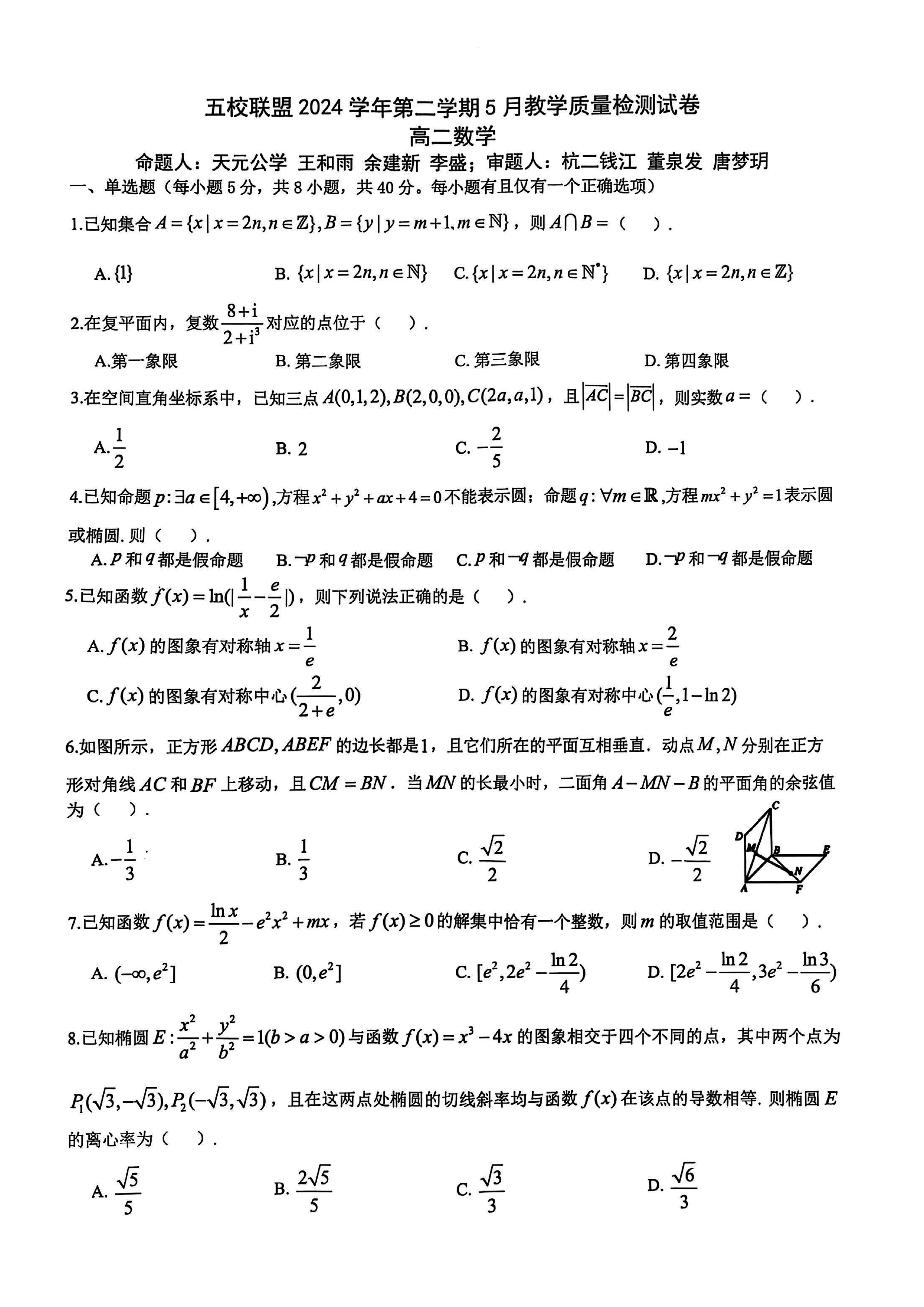 浙江省五校联盟2024-2025学年高二下学期5月质检数学试题及答案