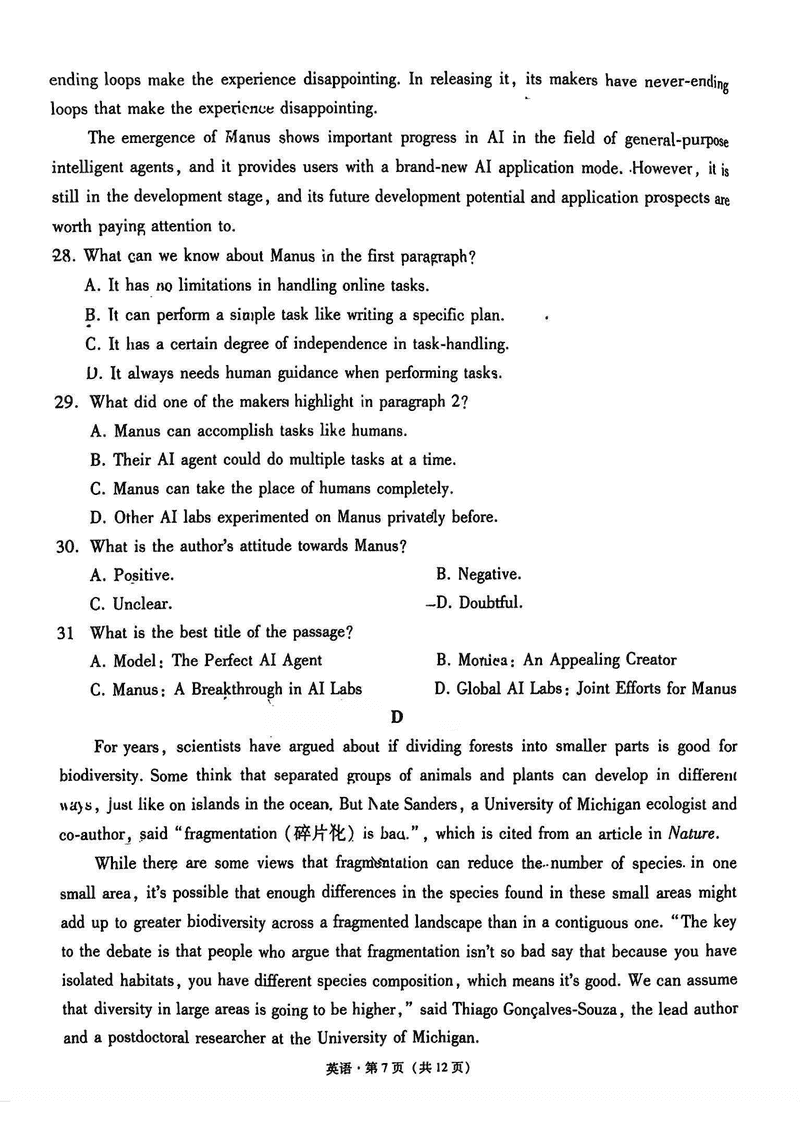 西南名校联盟2025届“3+3+3”高考备考诊断性联考(四)英语试题及答案