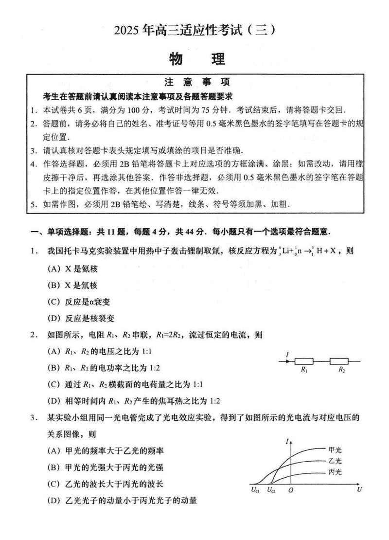 南通如皋2025年高三适应性考试(三)物理考试已于近日开考,为方便考生考后及时查看考试情况,查漏补缺、弥补不足,本文整理了试题答案解析相关信息!
