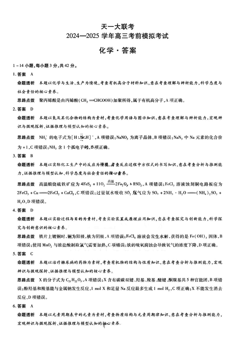 2025届河南省天一大联考高三考前模拟化学考试已于近日开考,为方便考生考后及时查看考试情况,查漏补缺、弥补不足,本文整理了试题答案解析相关信息!