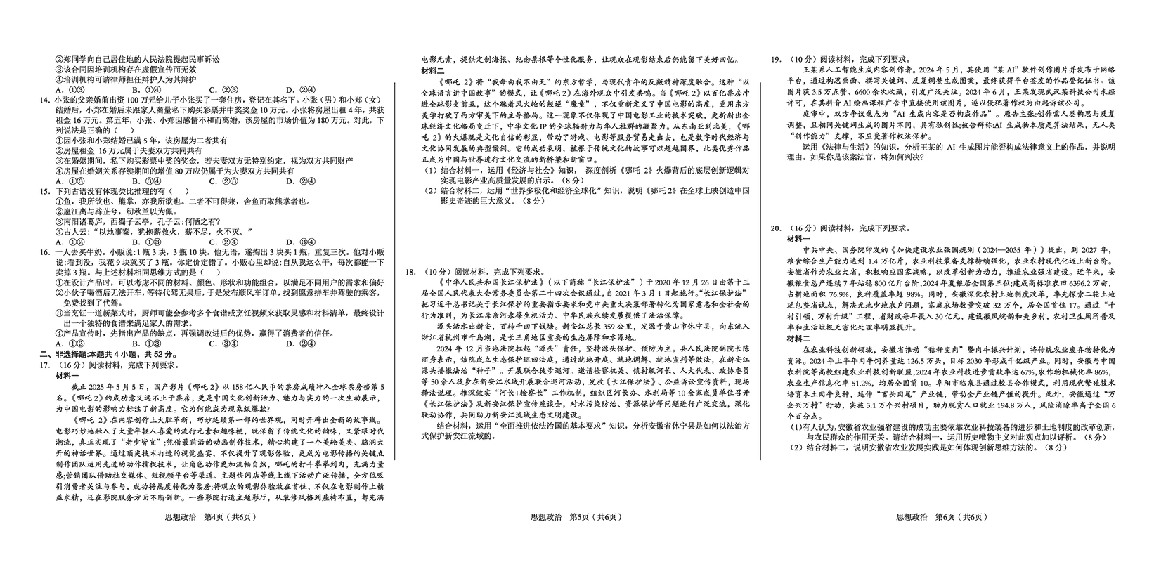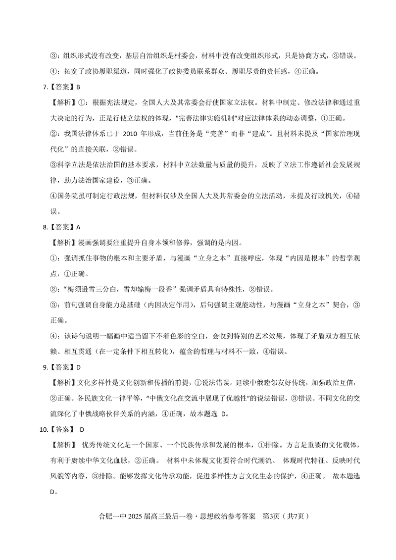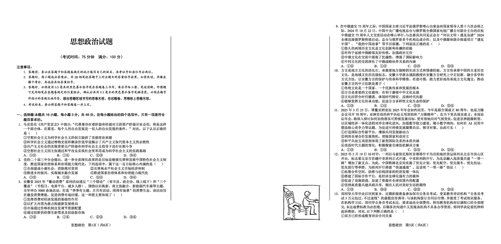 2025年合肥一中最后一卷政治试题及答案 时间:2025-05-26 安徽 文综试题 2025年合肥一中最后一卷政治考试已于近日开考,为方便考生考后及时查看考试情况,查漏补缺、弥补不足,本文整理了试题答案解析相关信息! 汇总:安徽省合肥一中2025届高三最后一卷试题及答案汇总 政治试题及答案解析