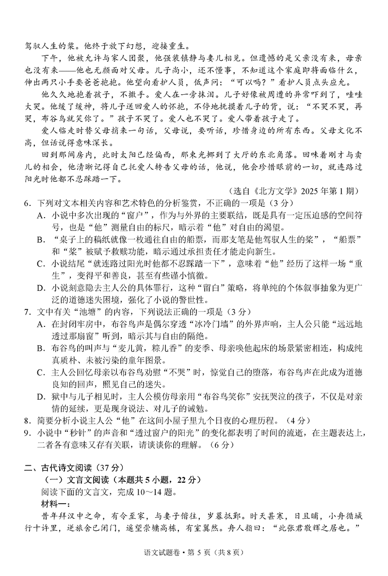 浙江六校联考2025届高三5月模拟语文试题及答案