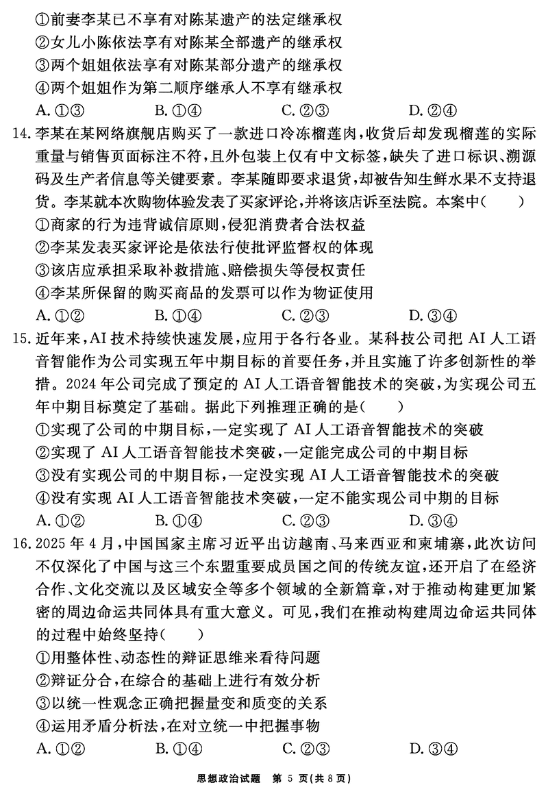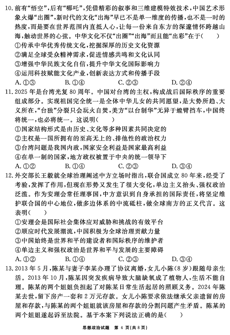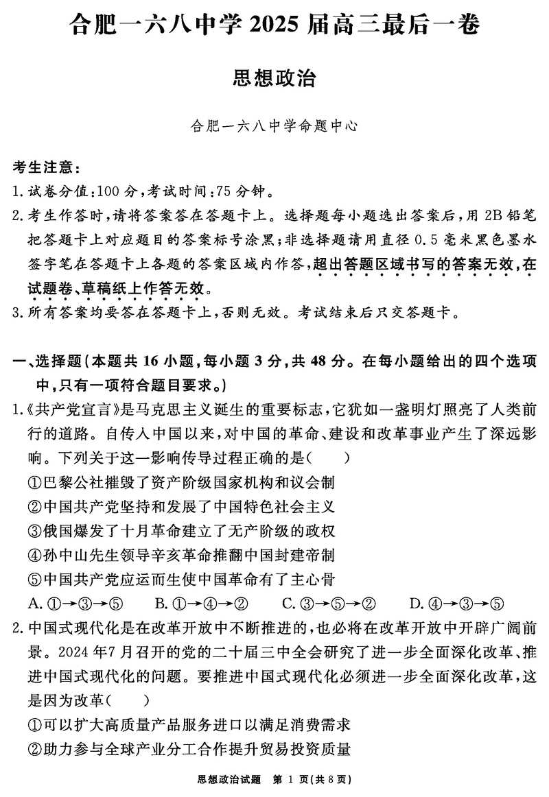 合肥一六八中学2025届高三最后一卷政治试题及答案 时间:2025-06-01 安徽 文综试题 合肥一六八中学2025届高三最后一卷政治考试已于近日开考,为方便考生考后及时查看考试情况,查漏补缺、弥补不足,本文整理了试题答案解析相关信息! 汇总:合肥一六八中学2025届高三最后一卷试题及答案汇总 政治试题及答案解析