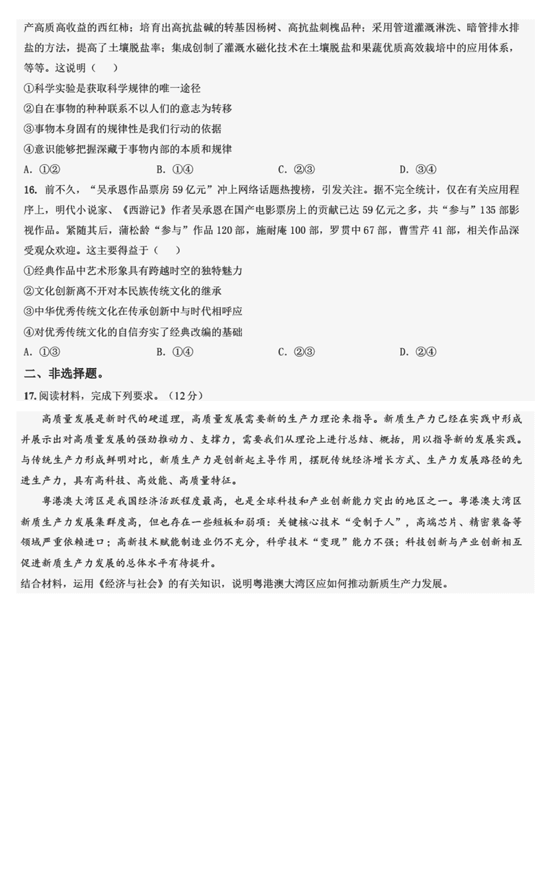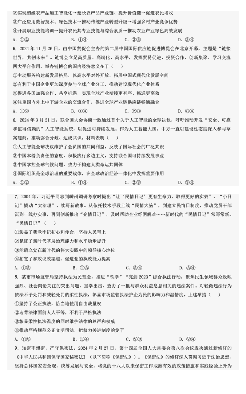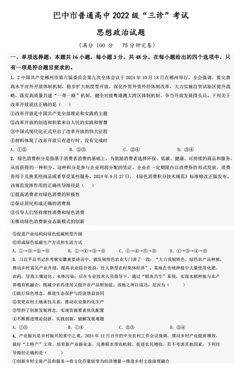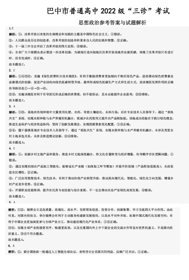巴中市普通高中2025届“三诊”政治试题及答案 时间:2025-06-01 四川 文综试题 巴中市普通高中2025届“三诊”政治考试已于近日开考,为方便考生考后及时查看考试情况,查漏补缺、弥补不足,本文整理了试题答案解析相关信息! 汇总:巴中市普通高中2025届“三诊”考试试题及答案汇总 政治试题及答案解析