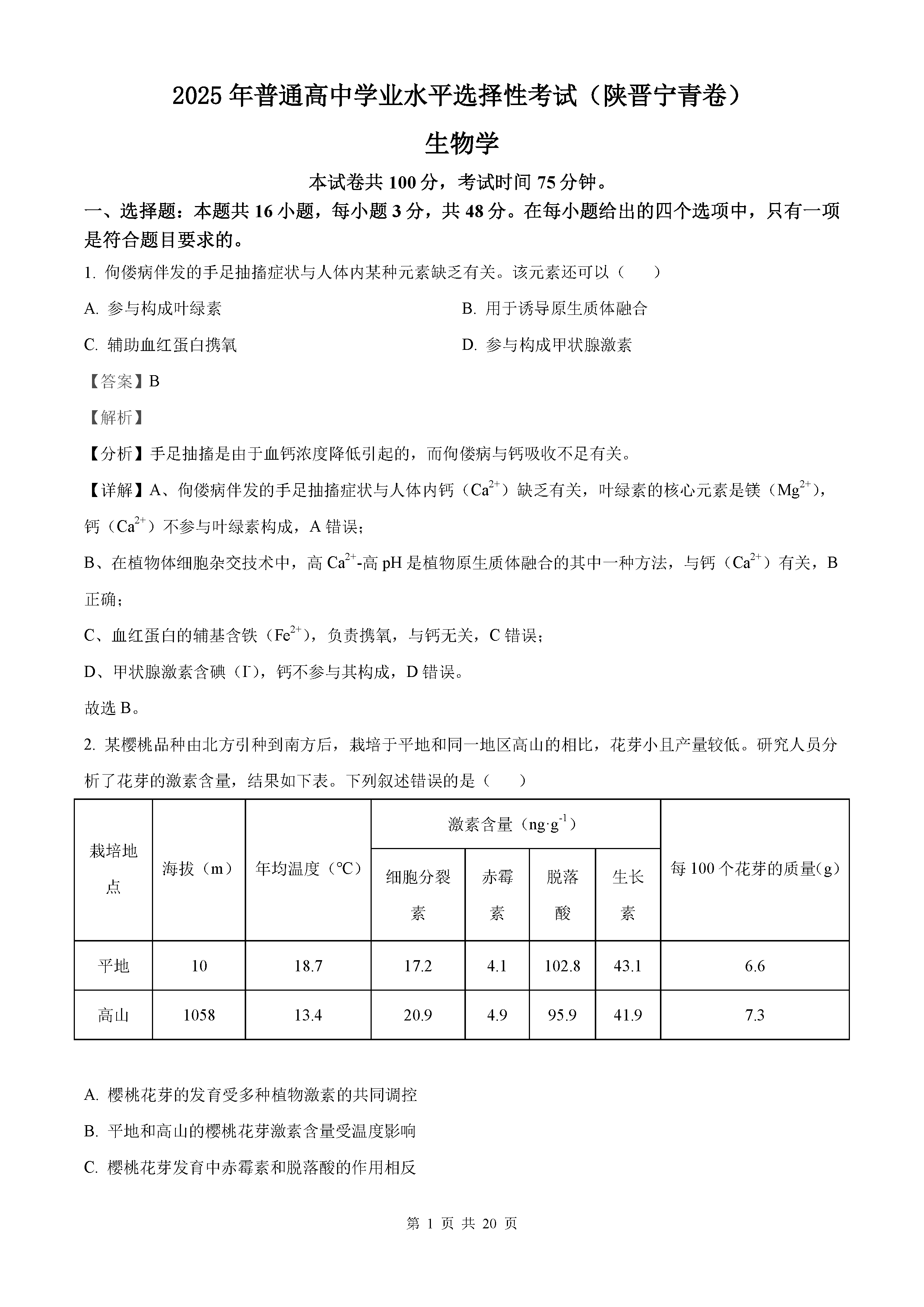 2025年陕西青海山西宁夏四省高考生物试题及答案解析