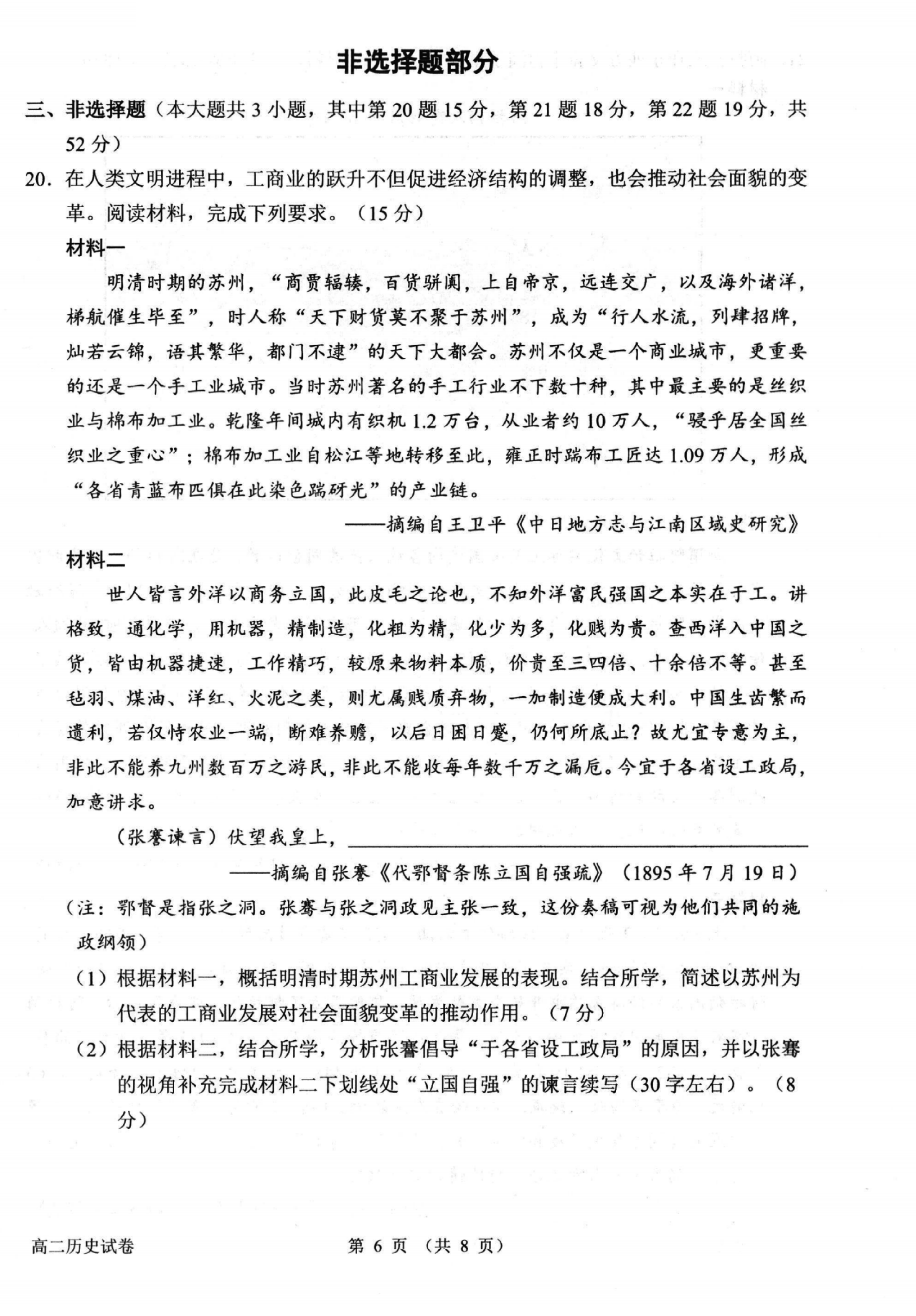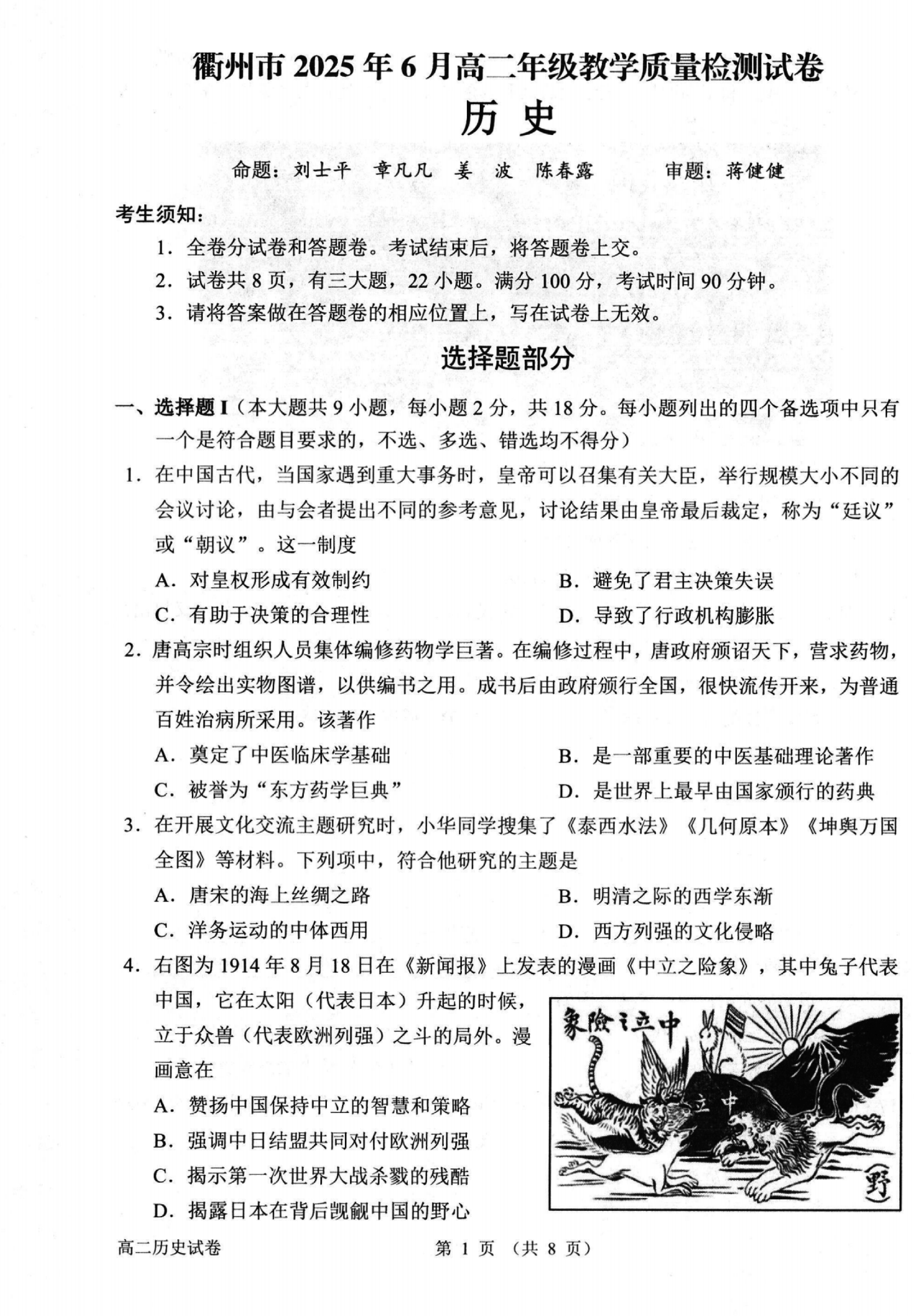 衢州市2025年6月高二下学期教学质量检测历史试题及答案 时间:2025-06-22 浙江 高中历史 浙江省衢州市2025年6月高二下学期教学质量检测历史考试已于近日开考,为方便考生考后及时查看考试情况,查漏补缺、弥补不足,本文整理了试题答案解析相关信息! 历史试题及答案解析