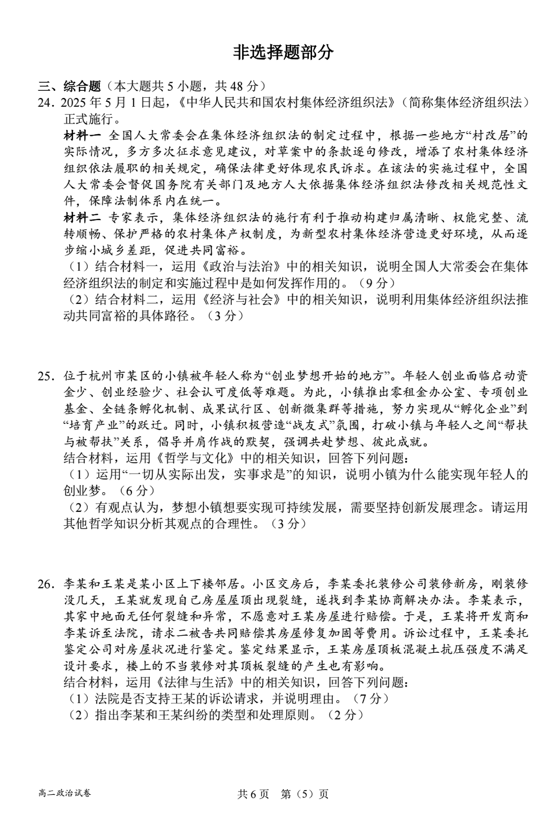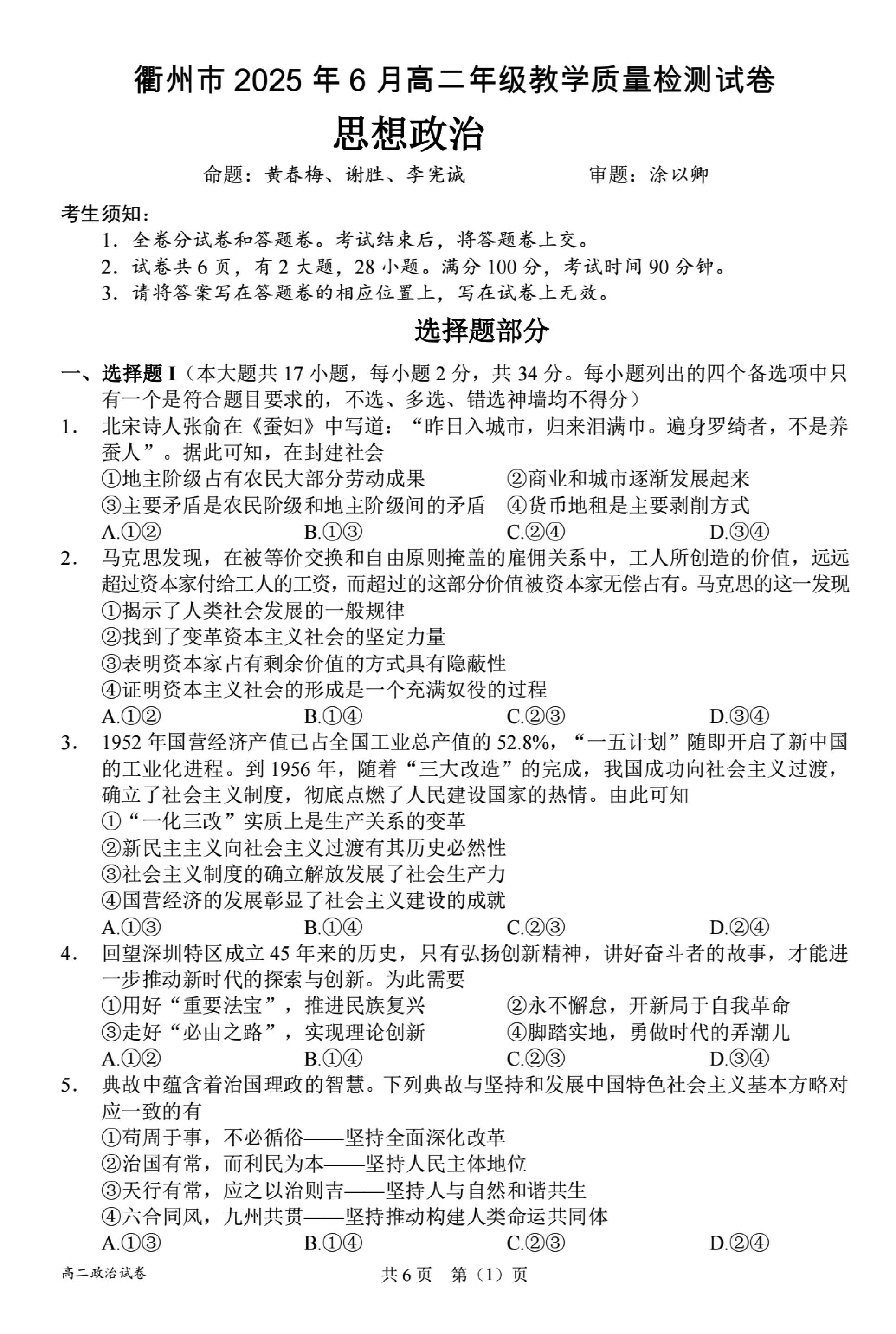 衢州市2025年6月高二下学期教学质量检测政治试题及答案 时间:2025-06-22 浙江 高中政治 浙江省衢州市2025年6月高二下学期教学质量检测政治考试已于近日开考,为方便考生考后及时查看考试情况,查漏补缺、弥补不足,本文整理了试题答案解析相关信息! 政治试题及答案解析