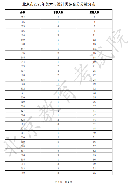 北京2025高考美术与设计类一分一段表已经公布,其中659分累计人数是7人;649分累计人数是12人;645分累计人数是18人;633分累计人数是29人;625分累计人数是44人。以下是小编整理的详细内容,大家可以看一看。