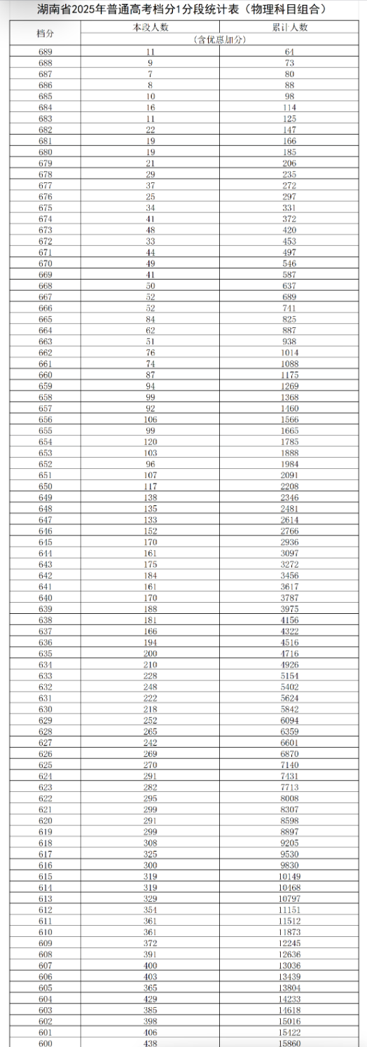2025湖南高考成绩物理类一分一段表出炉 最新位次排名