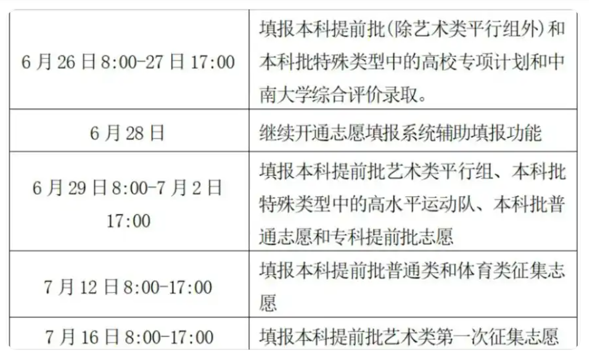 第二阶段:6月29日8:00-7月2日17:00,填报本科提前批艺术类平行组、本科批特殊类型中的高水平运动队、本科批普通志愿和专科提前批志愿;第三阶段:8月4日8:00-6日17:00,填报高职专科批志愿。具体填报时间(含各批次征集志愿填报时间)详见下表: